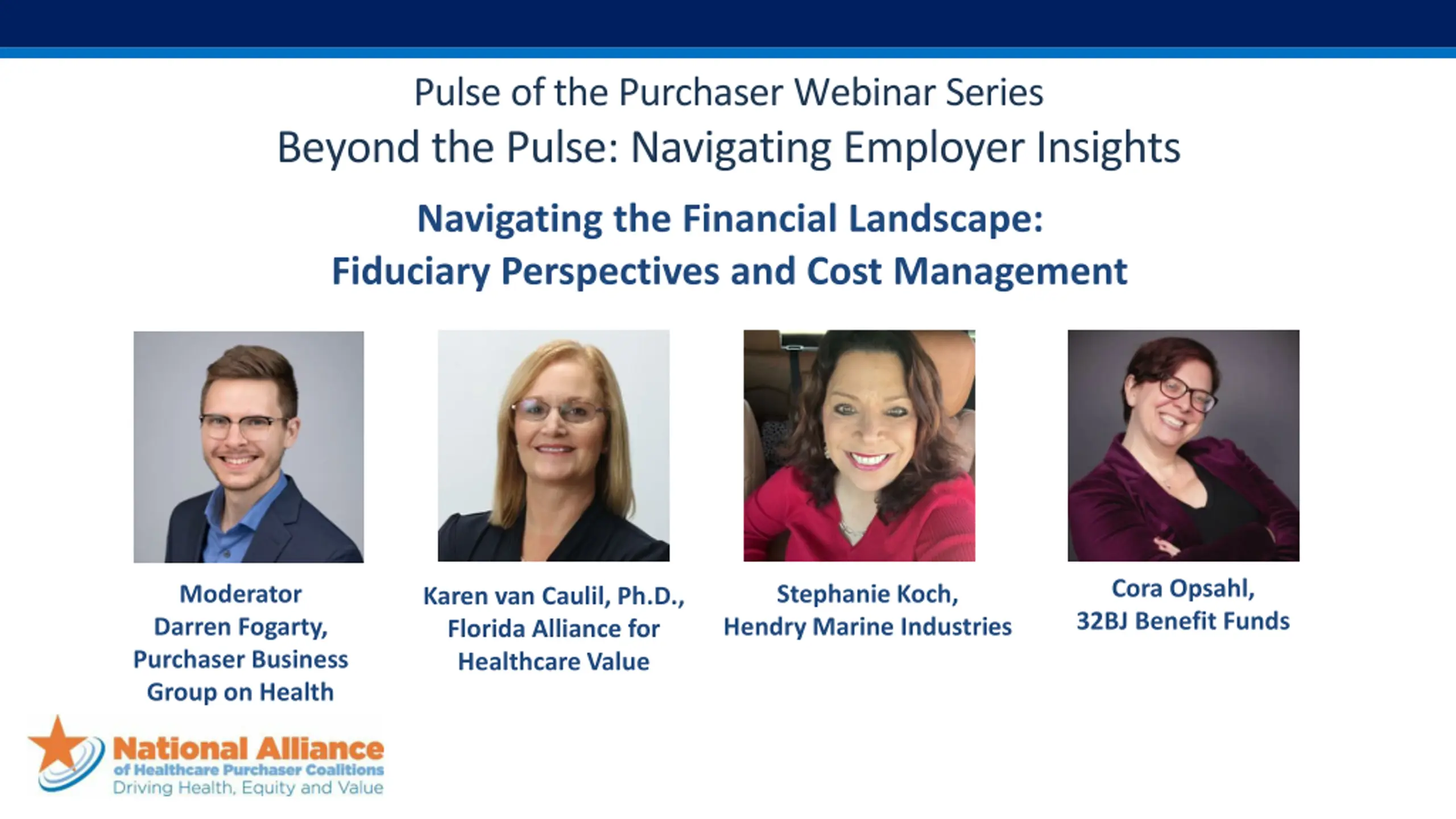 Pulse of the Purchaser Webinar Series Beyond the Pulse: Navigating Employer Insights Navigating the Financial Landscape: Fiduciary Perspectives and Cost Management Cora Opsahl, 32BJ Benefit Funds Moderator Darren Fogarty, Purchaser Business Group on Health Stephanie Koch, Hendry Marine Industries Karen van Caulil, Ph.D., Florida Alliance for Healthcare Value