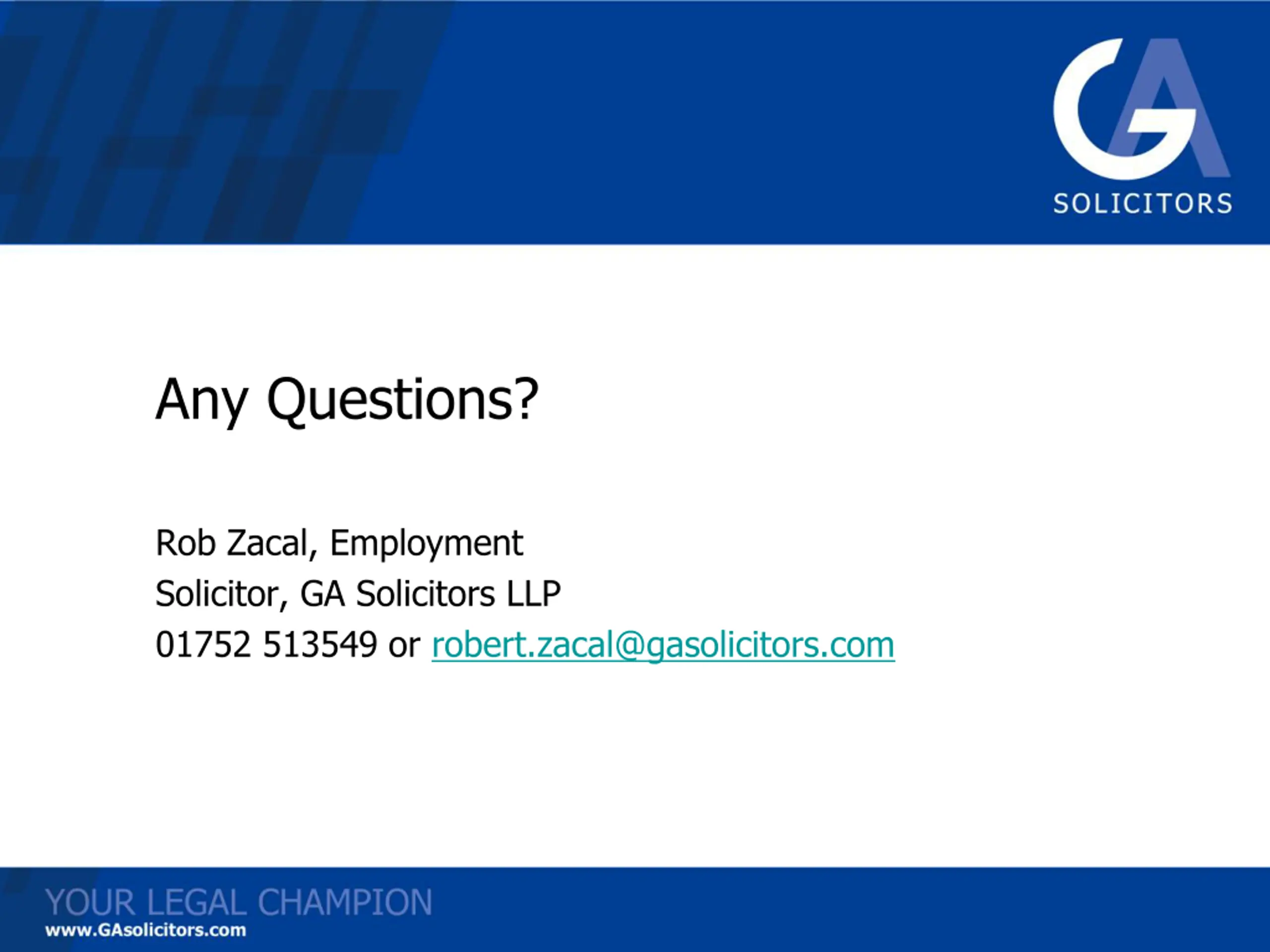 Any Questions? Rob Zacal, Employment Solicitor, GA Solicitors LLP 01752 513549 or robert.zacal@gasolicitors.com