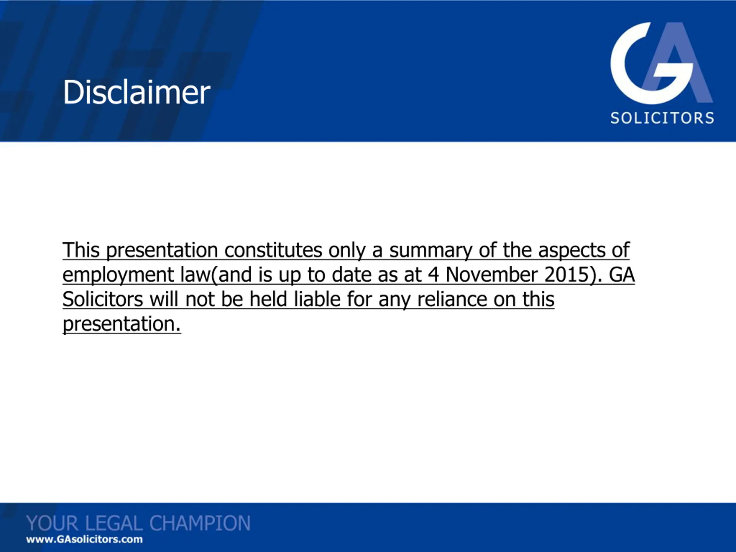 Disclaimer This presentation constitutes only a summary of the aspects of employment law(and is up to date as at 4 November 2015). GA Solicitors will not be held liable for any reliance on this presentation.