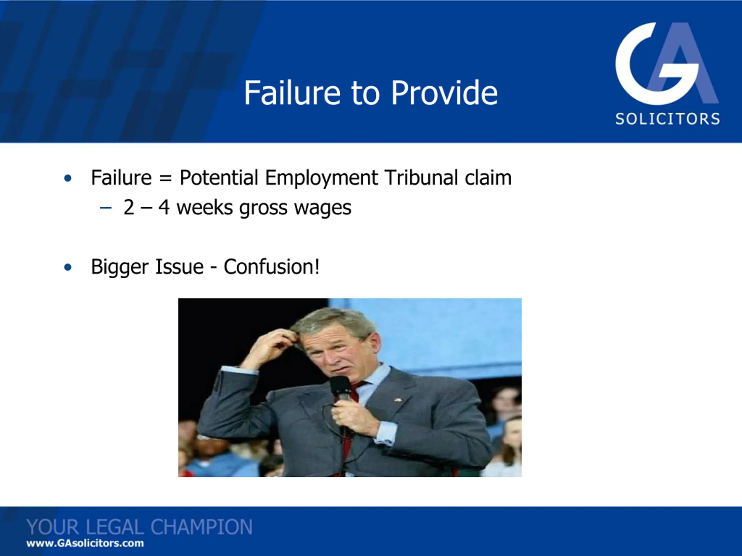 Failure to Provide Failure = Potential Employment Tribunal claim 2 4 weeks gross wages Bigger Issue - Confusion!