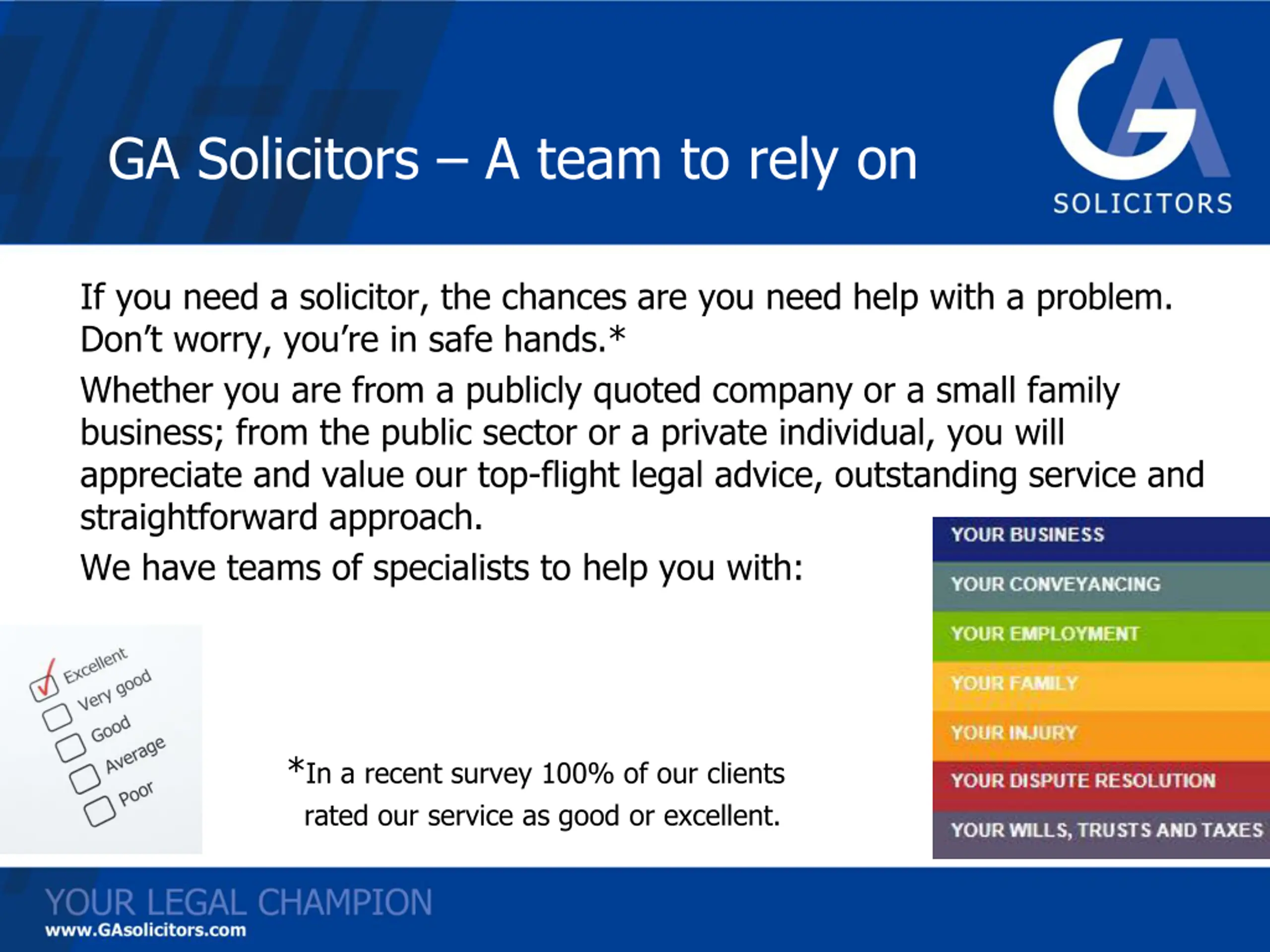 GA Solicitors A team to rely on If you need a solicitor, the chances are you need help with a problem. Don t worry, you re in safe hands.* Whether you are from a publicly quoted company or a small family business; from the public sector or a private individual, you will appreciate and value our top-flight legal advice, outstanding service and straightforward approach. We have teams of specialists to help you with: *In a recent survey 100% of our clients rated our service as good or excellent.