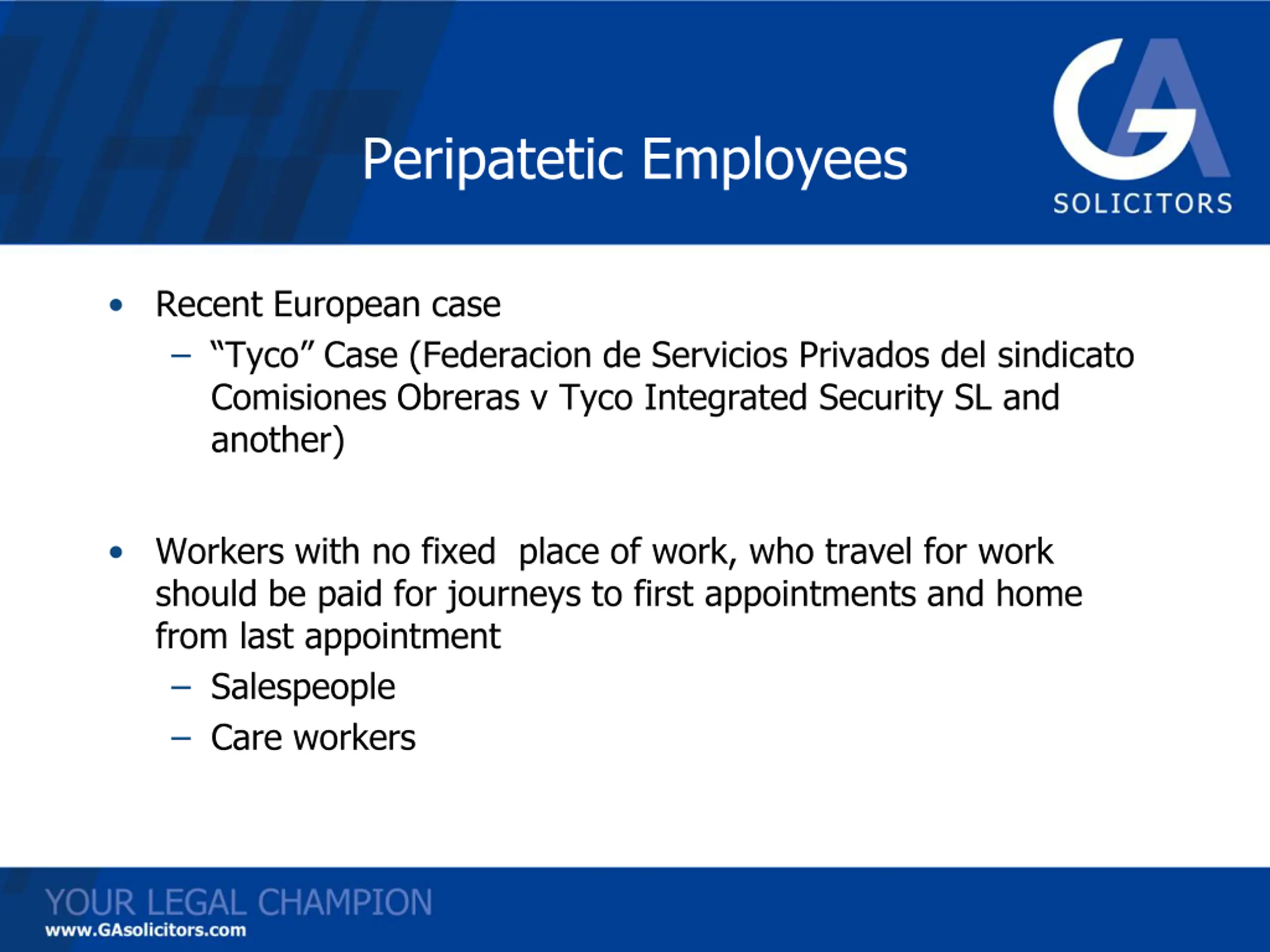 Peripatetic Employees Recent European case Tyco Case (Federacion de Servicios Privados del sindicato Comisiones Obreras v Tyco Integrated Security SL and another) Workers with no fixed place of work, who travel for work should be paid for journeys to first appointments and home from last appointment Salespeople Care workers
