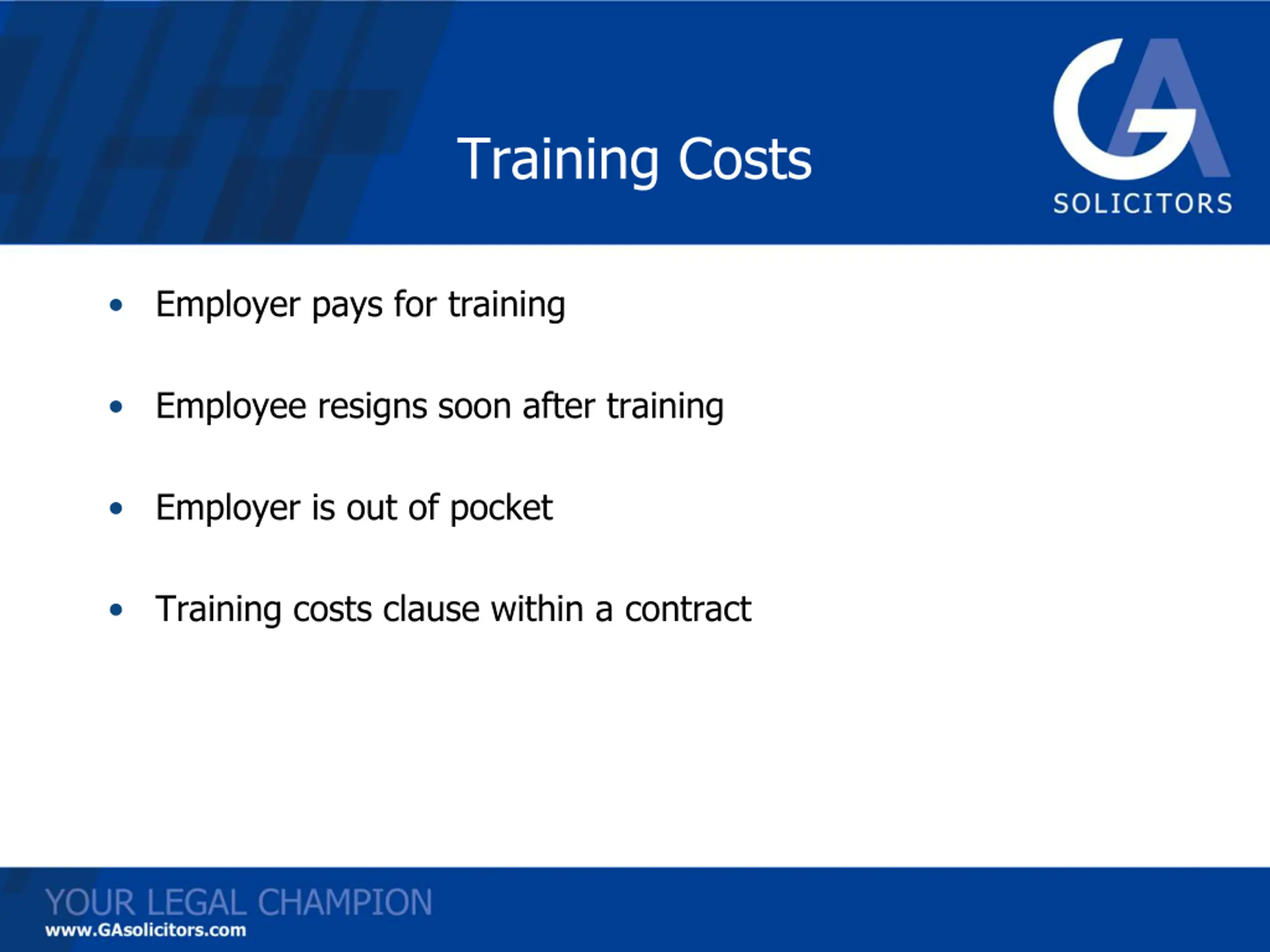 Training Costs Employer pays for training Employee resigns soon after training Employer is out of pocket Training costs clause within a contract