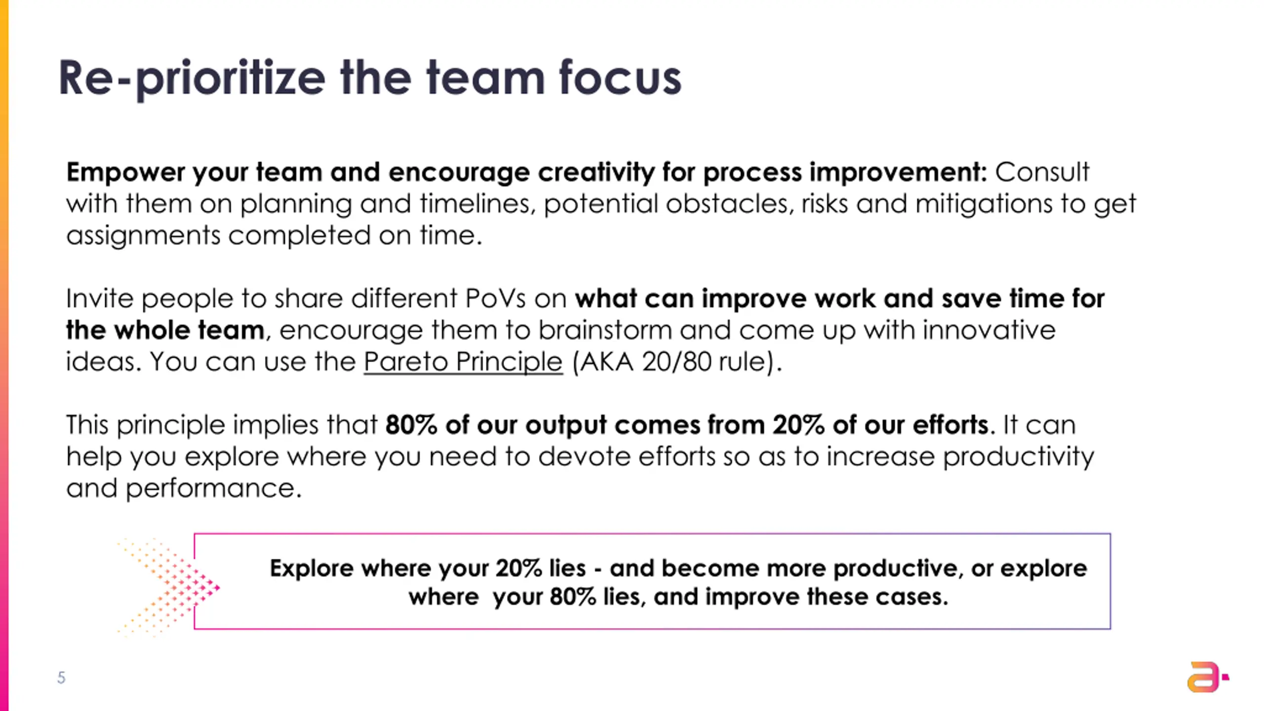 Re-prioritize the team focus Empower your team and encourage creativity for process improvement: Consult with them on planning and timelines, potential obstacles, risks and mitigations to get assignments completed on time. Invite people to share different PoVs on what can improve work and save time for the whole team, encourage them to brainstorm and come up with innovative ideas. You can use the Pareto Principle (AKA 20/80 rule). This principle implies that 80% of our output comes from 20% of our efforts. It can help you explore where you need to devote efforts so as to increase productivity and performance. Explore where your 20% lies - and become more productive, or explore where your 80% lies, and improve these cases. 5