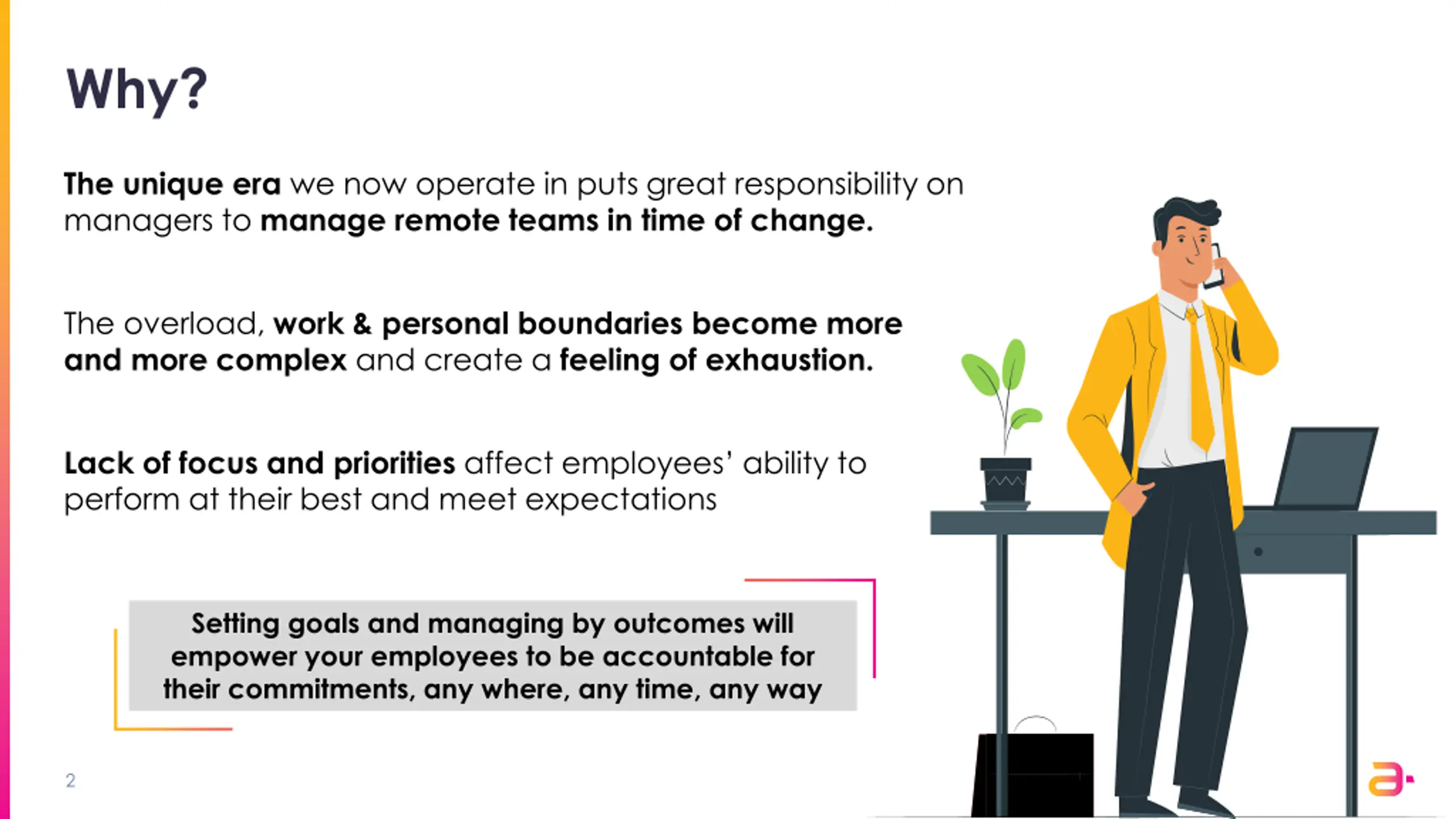 Why? The unique era we now operate in puts great responsibility on managers to manage remote teams in time of change. The overload, work & personal boundaries become more and more complex and create a feeling of exhaustion. Lack of focus and priorities affect employees ability to perform at their best and meet expectations Setting goals and managing by outcomes will empower your employees to be accountable for their commitments, any where, any time, any way 2