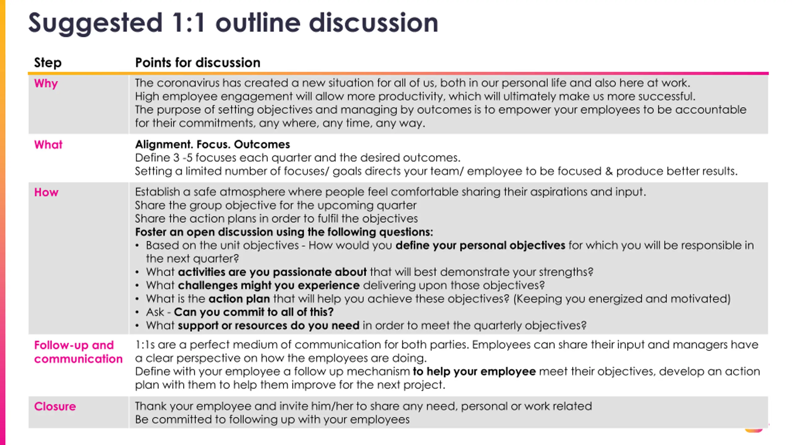 Suggested 1:1 outline discussion Step Why Points for discussion The coronavirus has created a new situation for all of us, both in our personal life and also here at work. High employee engagement will allow more productivity, which will ultimately make us more successful. The purpose of setting objectives and managing by outcomes is to empower your employees to be accountable for their commitments, any where, any time, any way. Alignment. Focus. Outcomes Define 3 -5 focuses each quarter and the desired outcomes. Setting a limited number of focuses/ goals directs your team/ employee to be focused & produce better results. What Establish a safe atmosphere where people feel comfortable sharing their aspirations and input. Share the group objective for the upcoming quarter Share the action plans in order to fulfil the objectives Foster an open discussion using the following questions: Based on the unit objectives - How would you define your personal objectives for which you will be responsible in the next quarter? What activities are you passionate about that will best demonstrate your strengths? What challenges might you experience delivering upon those objectives? What is the action plan that will help you achieve these objectives? (Keeping you energized and motivated) Ask - Can you commit to all of this? What support or resources do you need in order to meet the quarterly objectives? 1:1s are a perfect medium of communication for both parties. Employees can share their input and managers have a clear perspective on how the employees are doing. Define with your employee a follow up mechanism to help your employee meet their objectives, develop an action plan with them to help them improve for the next project. How Follow-up and communication Thank your employee and invite him/her to share any need, personal or work related Be committed to following up with your employees Closure 9