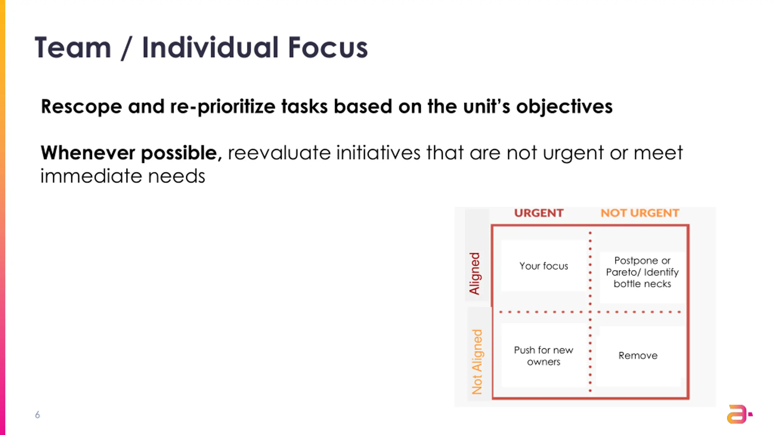 Team / Individual Focus Rescope and re-prioritize tasks based on the unit s objectives Whenever possible, reevaluate initiatives that are not urgent or meet immediate needs Aligned Postpone or Pareto/ Identify bottle necks Your focus Not Aligned Push for new owners Remove 6