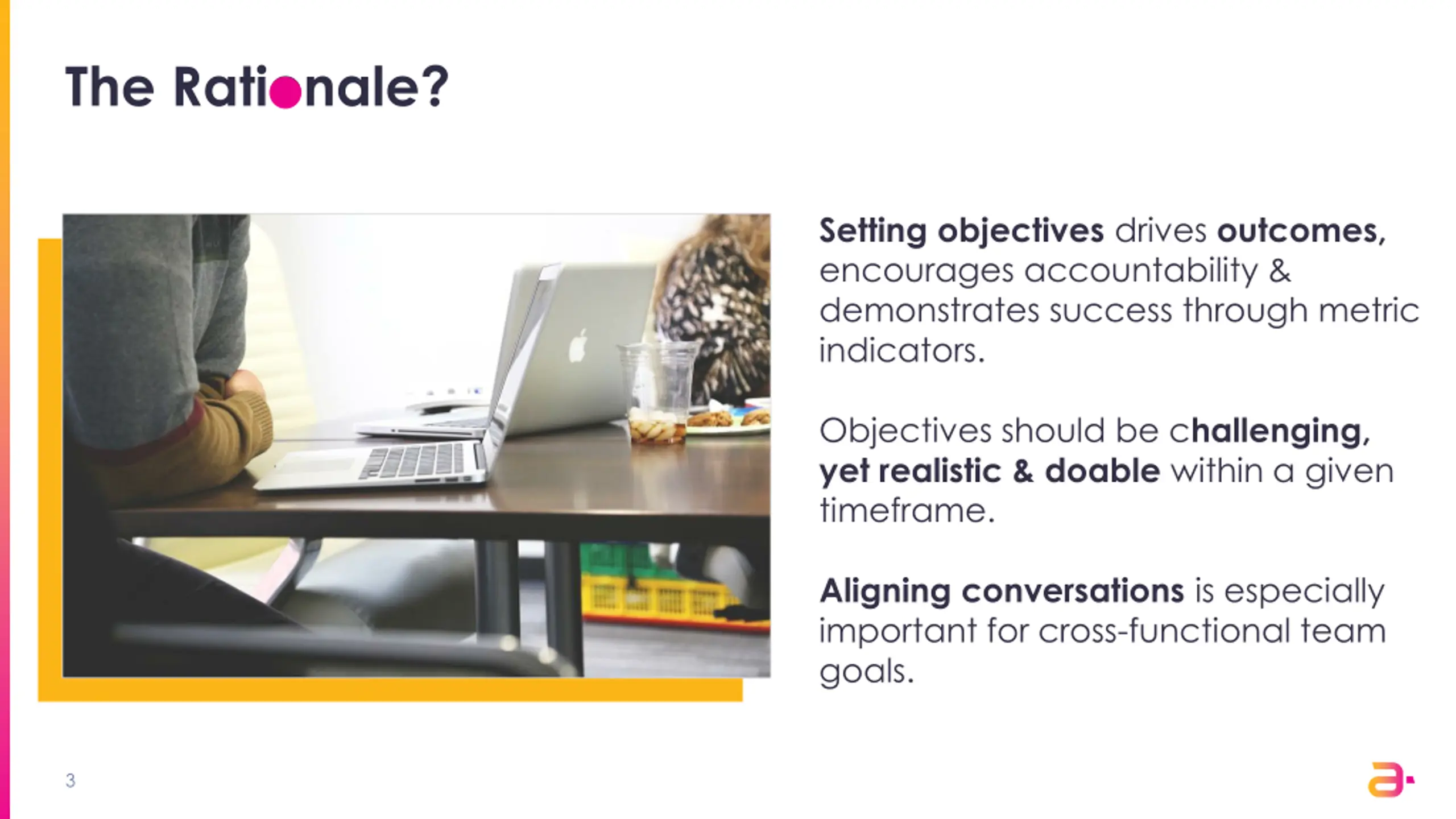 The Rationale? Setting objectives drives outcomes, encourages accountability & demonstrates success through metric indicators. Objectives should be challenging, yet realistic & doable within a given timeframe. Aligning conversations is especially important for cross-functional team goals. 3