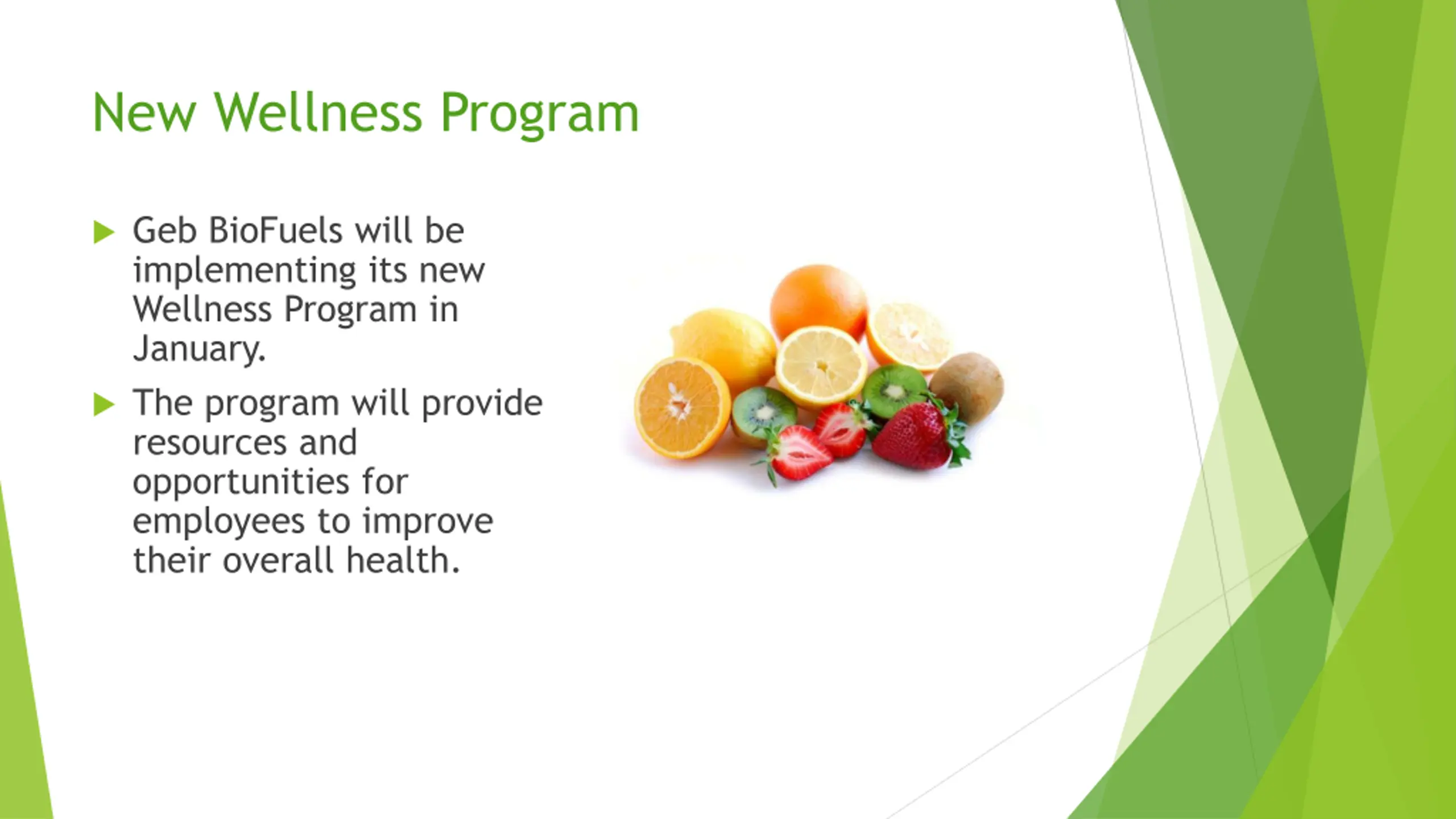 New Wellness Program Geb BioFuels will be implementing its new Wellness Program in January. The program will provide resources and opportunities for employees to improve their overall health.
