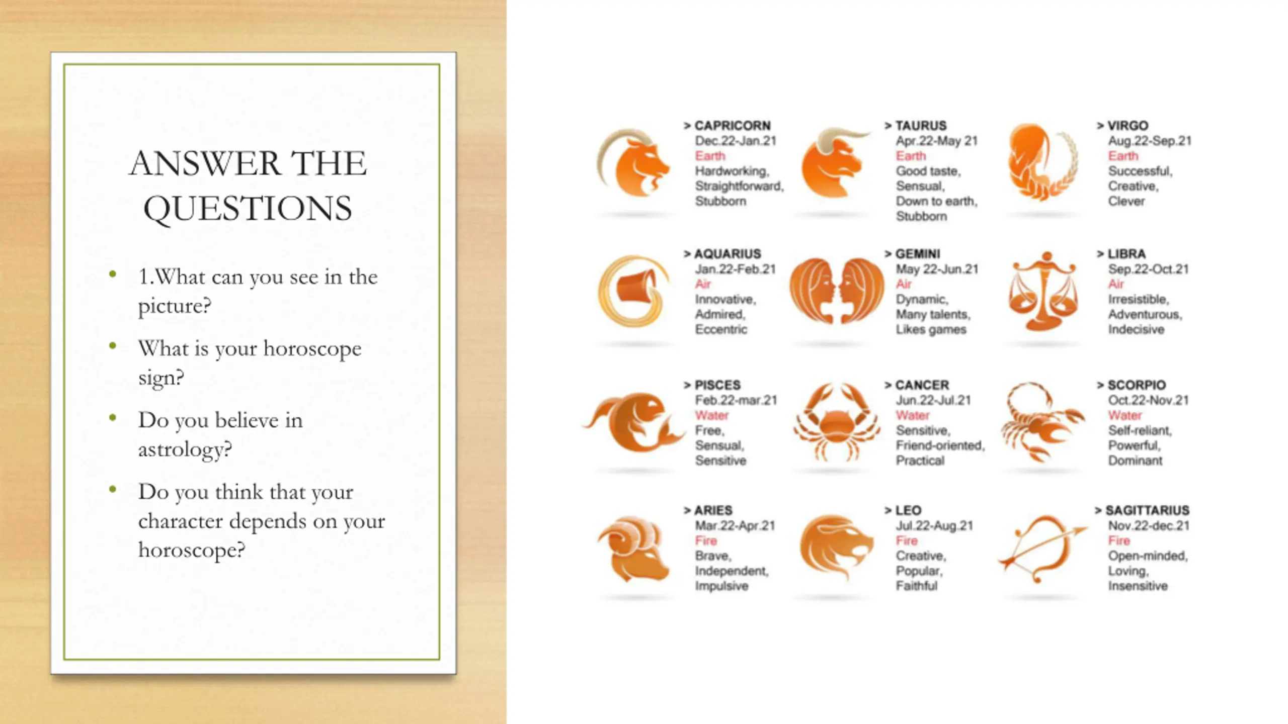 ANSWER THE QUESTIONS 1.What can you see in the picture? What is your horoscope sign? Do you believe in astrology? Do you think that your character depends on your horoscope?