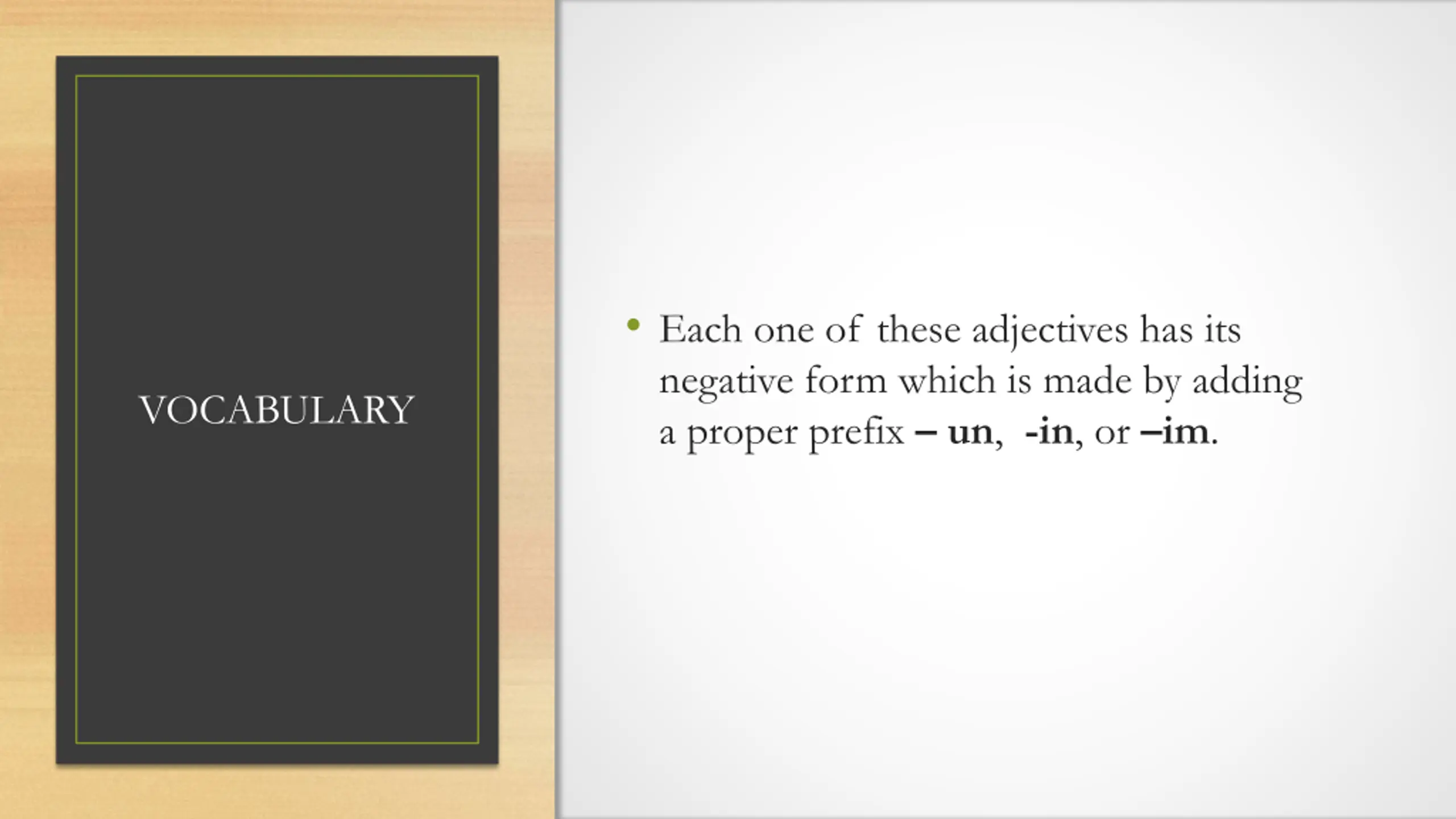 Each one of these adjectives has its negative form which is made by adding a proper prefix un, -in, or im. VOCABULARY