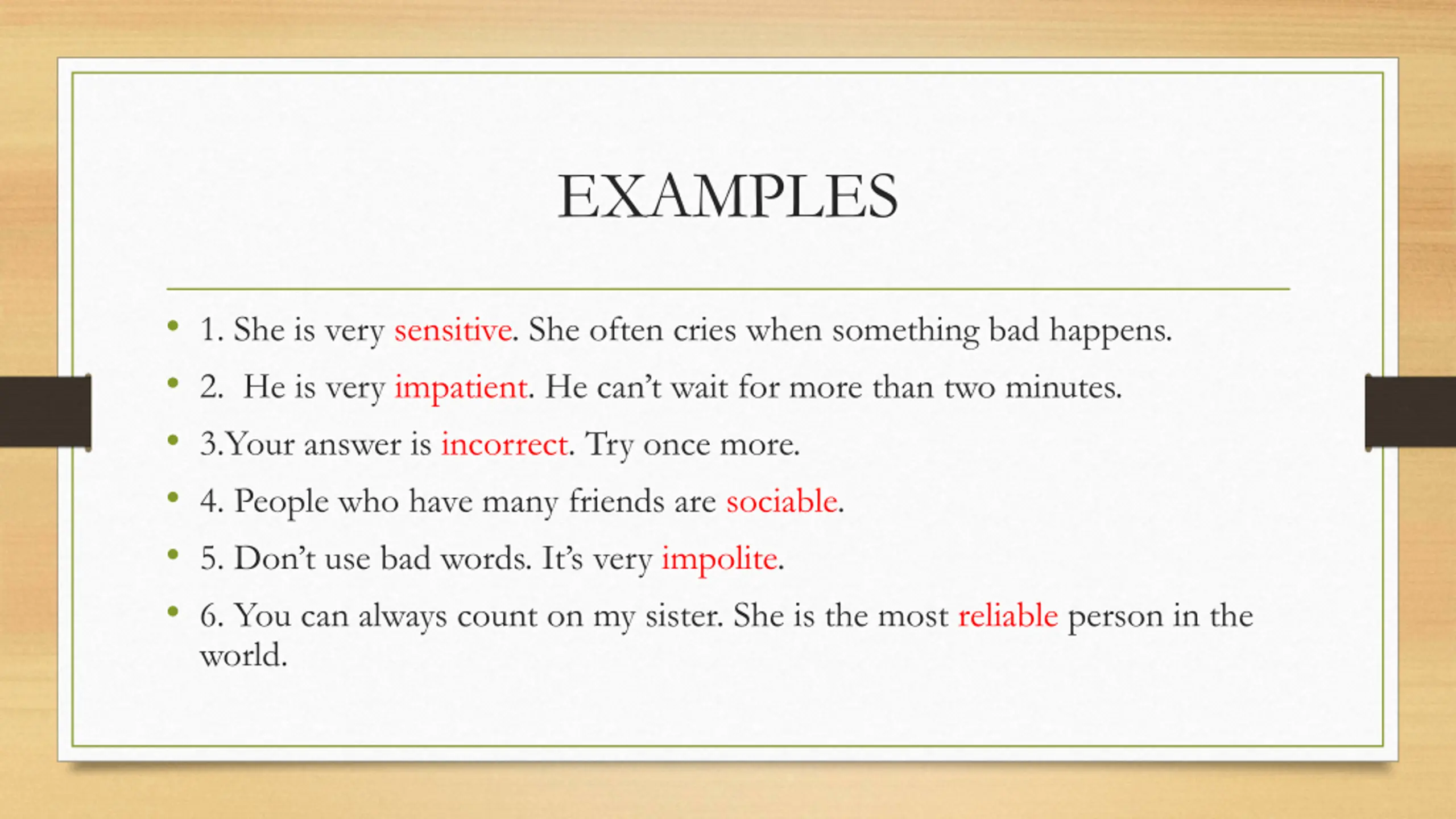 EXAMPLES 1. She is very sensitive. She often cries when something bad happens. 2. He is very impatient. He can t wait for more than two minutes. 3.Your answer is incorrect. Try once more. 4. People who have many friends are sociable. 5. Don t use bad words. It s very impolite. 6. You can always count on my sister. She is the most reliable person in the world.