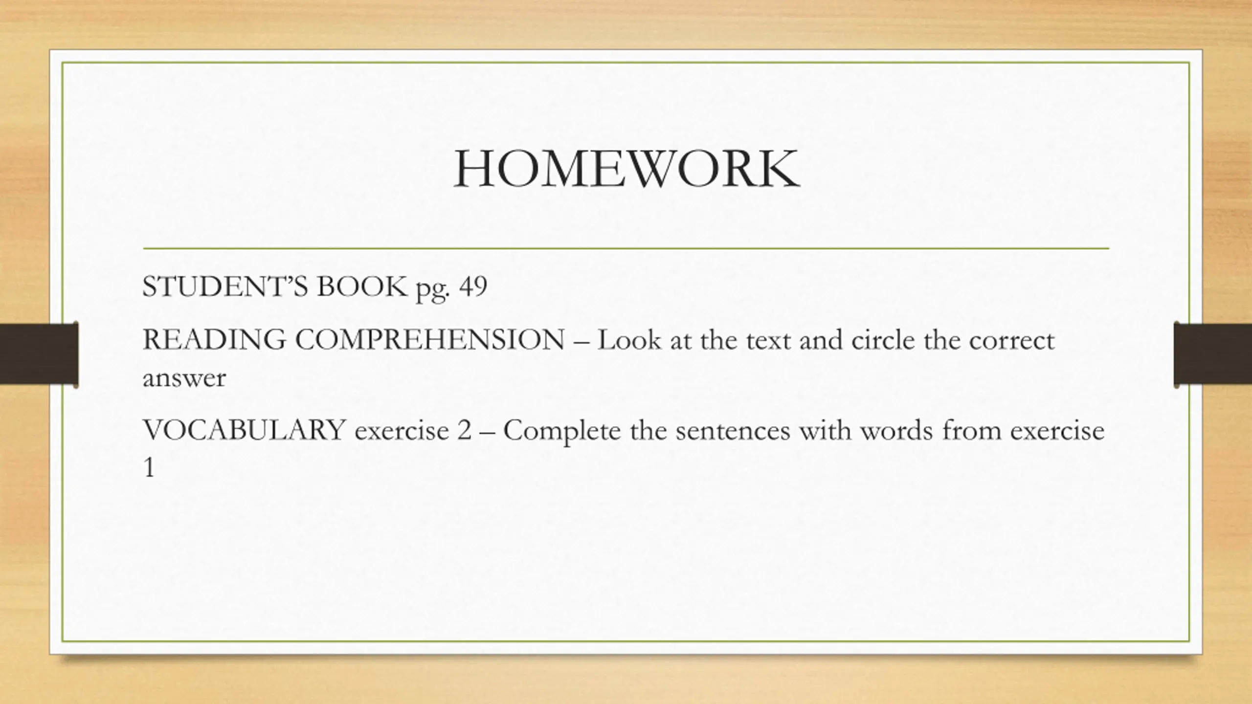 HOMEWORK STUDENT S BOOK pg. 49 READING COMPREHENSION Look at the text and circle the correct answer VOCABULARY exercise 2 Complete the sentences with words from exercise 1