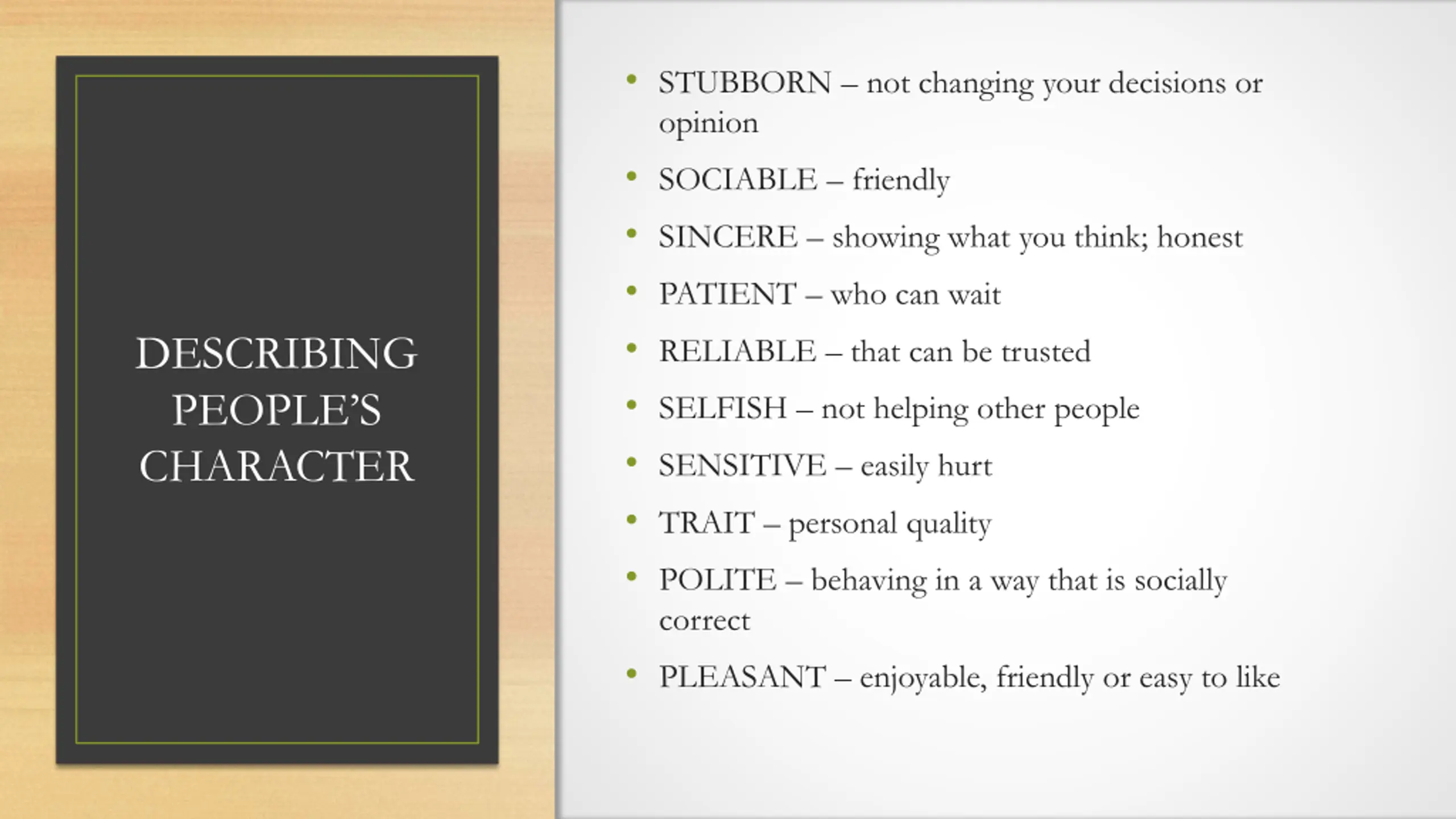 STUBBORN not changing your decisions or opinion SOCIABLE friendly SINCERE showing what you think; honest PATIENT who can wait RELIABLE that can be trusted SELFISH not helping other people SENSITIVE easily hurt TRAIT personal quality POLITE behaving in a way that is socially correct PLEASANT enjoyable, friendly or easy to like DESCRIBING PEOPLE S CHARACTER