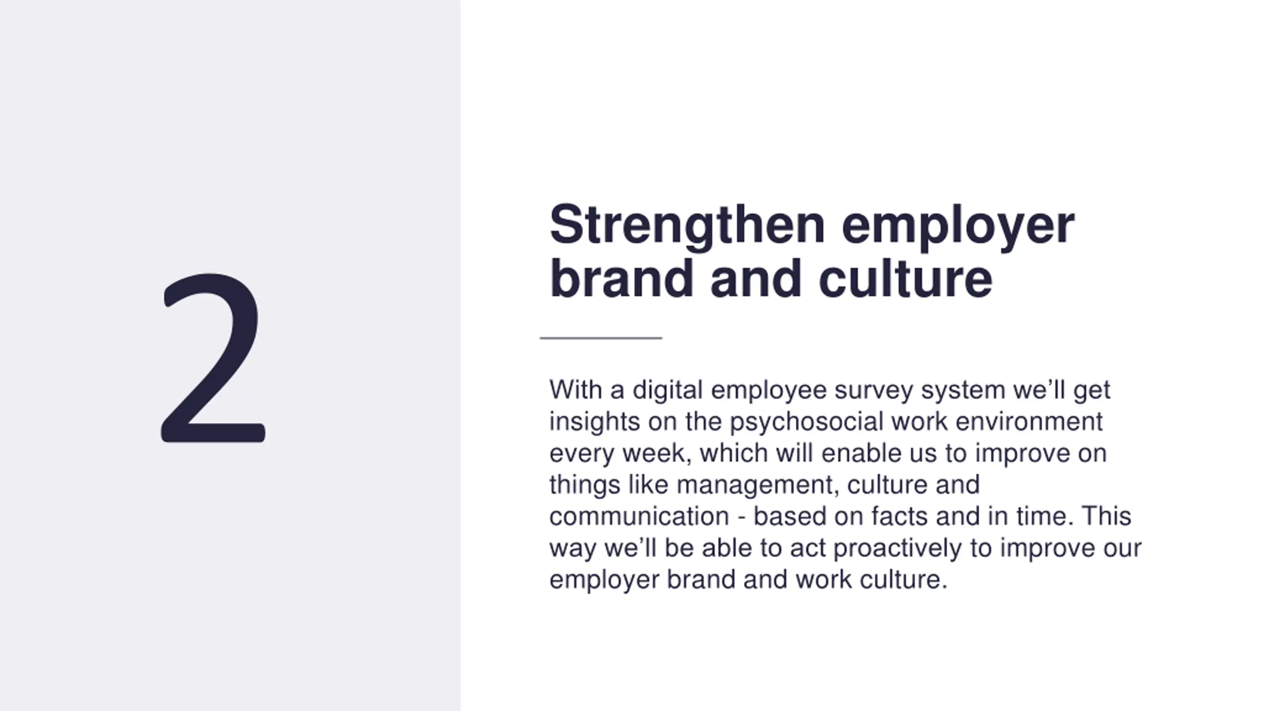 11 Strengthen employer brand and culture 2 With a digital employee survey system we ll get insights on the psychosocial work environment every week, which will enable us to improve on things like management, culture and communication - based on facts and in time. This way we ll be able to act proactively to improve our employer brand and work culture.