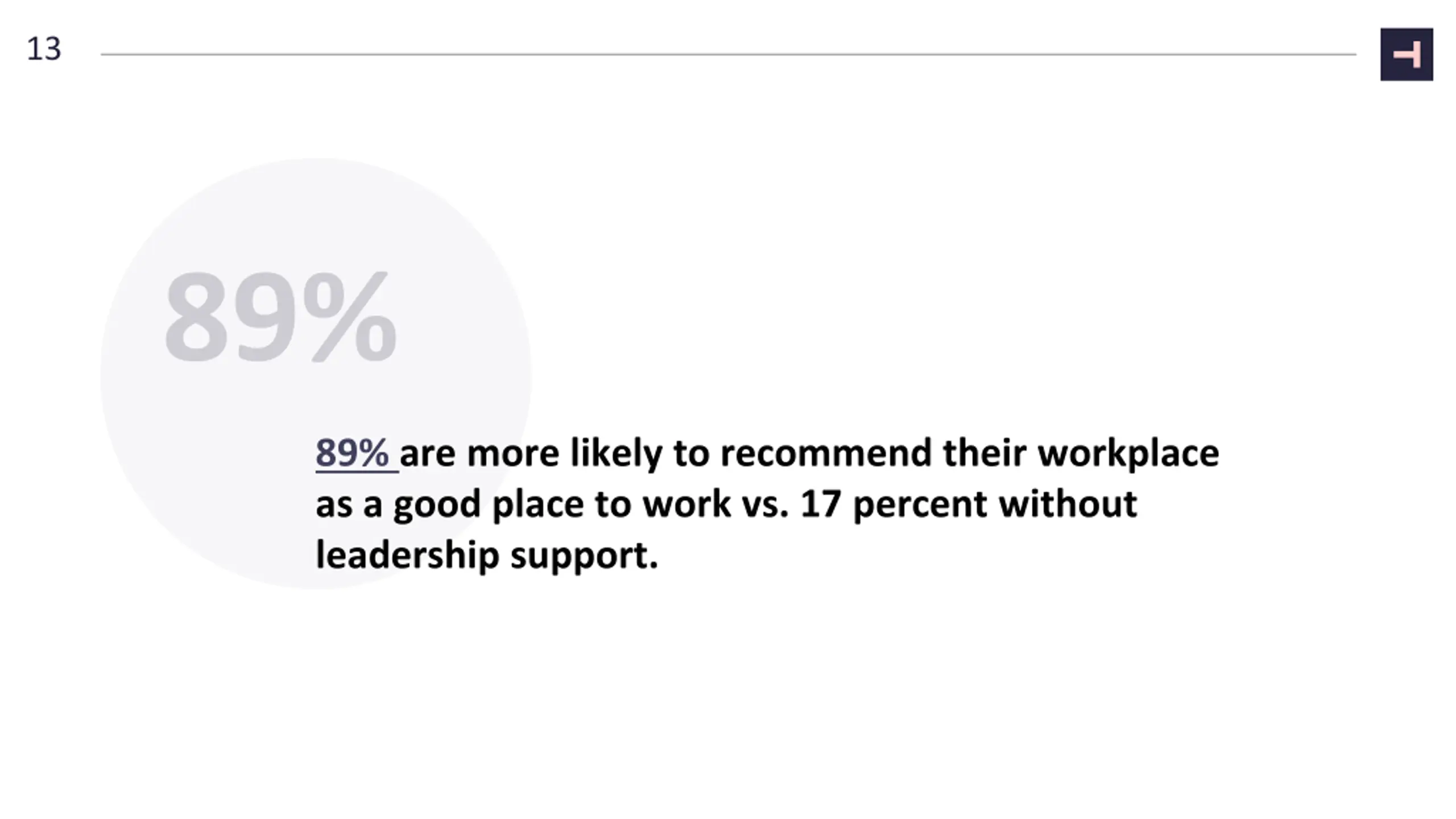 13 89% are more likely to recommend their workplace as a good place to work vs. 17 percent without leadership support.