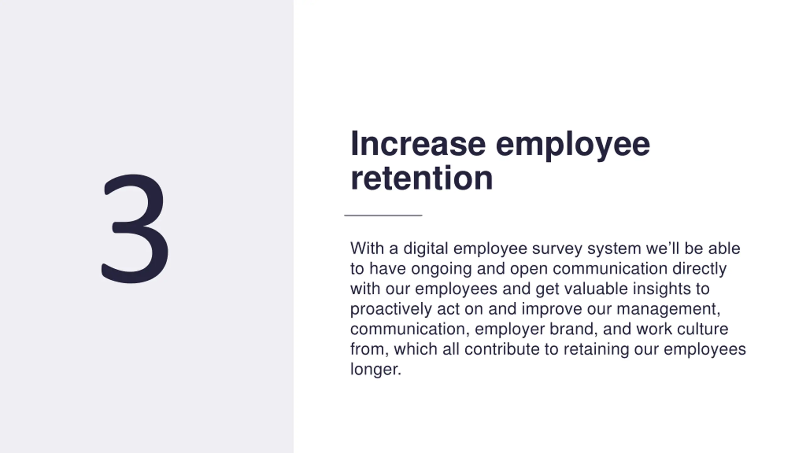 14 Increase employee retention 3 With a digital employee survey system we ll be able to have ongoing and open communication directly with our employees and get valuable insights to proactively act on and improve our management, communication, employer brand, and work culture from, which all contribute to retaining our employees longer.