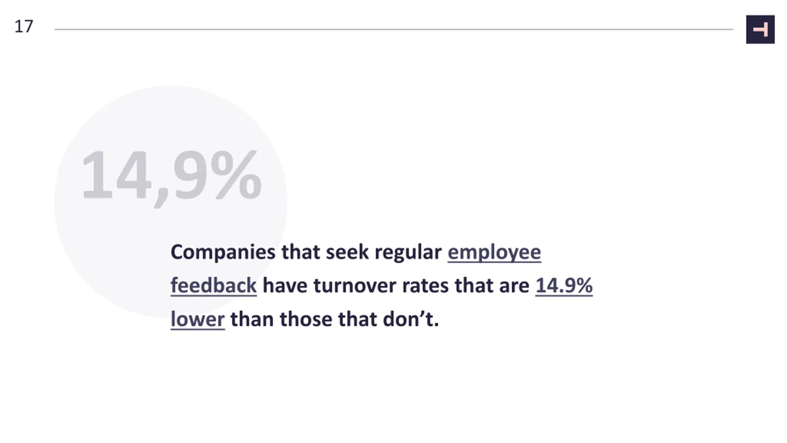 17 Companies that seek regular employee feedback have turnover rates that are 14.9% lower than those that don t.