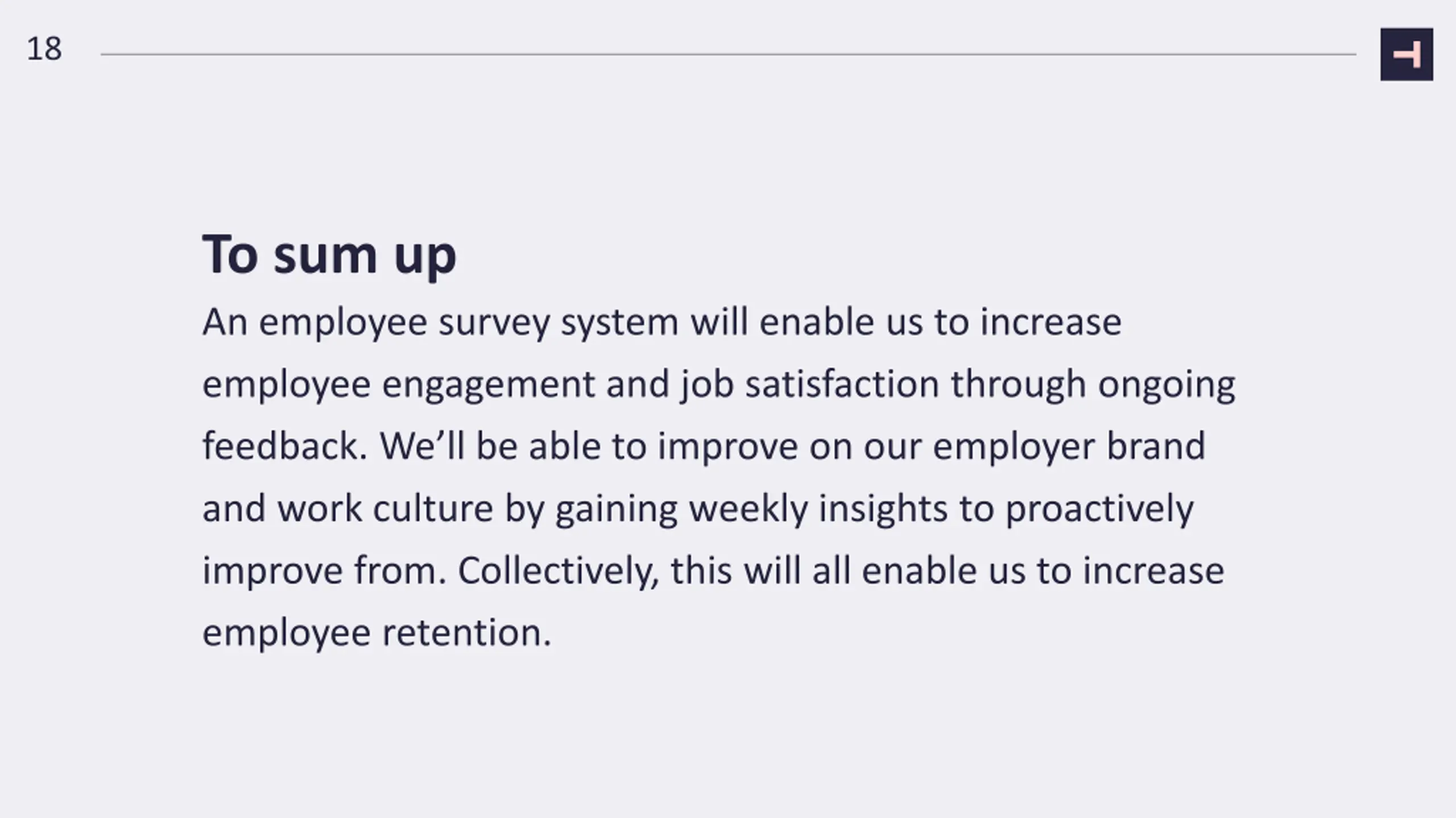 18 To sum up An employee survey system will enable us to increase employee engagement and job satisfaction through ongoing feedback. We ll be able to improve on our employer brand and work culture by gaining weekly insights to proactively improve from. Collectively, this will all enable us to increase employee retention.