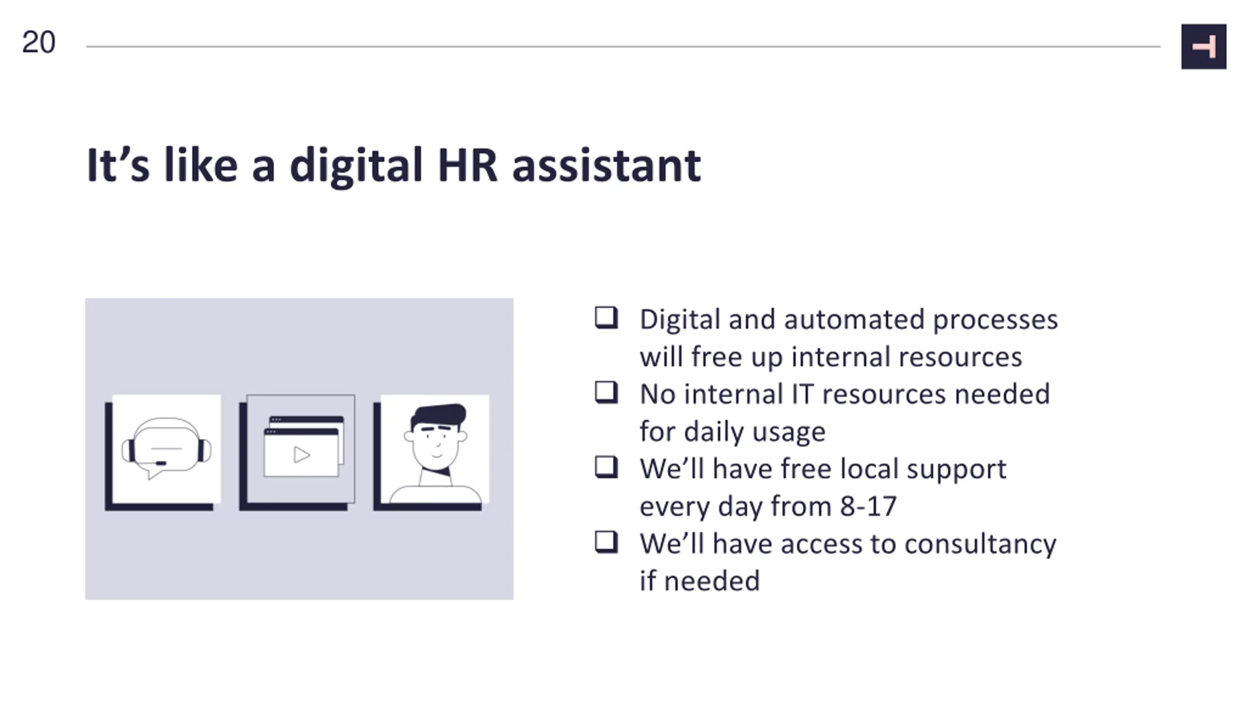 20 It s like a digital HR assistant Digital and automated processes will free up internal resources No internal IT resources needed for daily usage We ll have free local support every day from 8-17 We ll have access to consultancy if needed