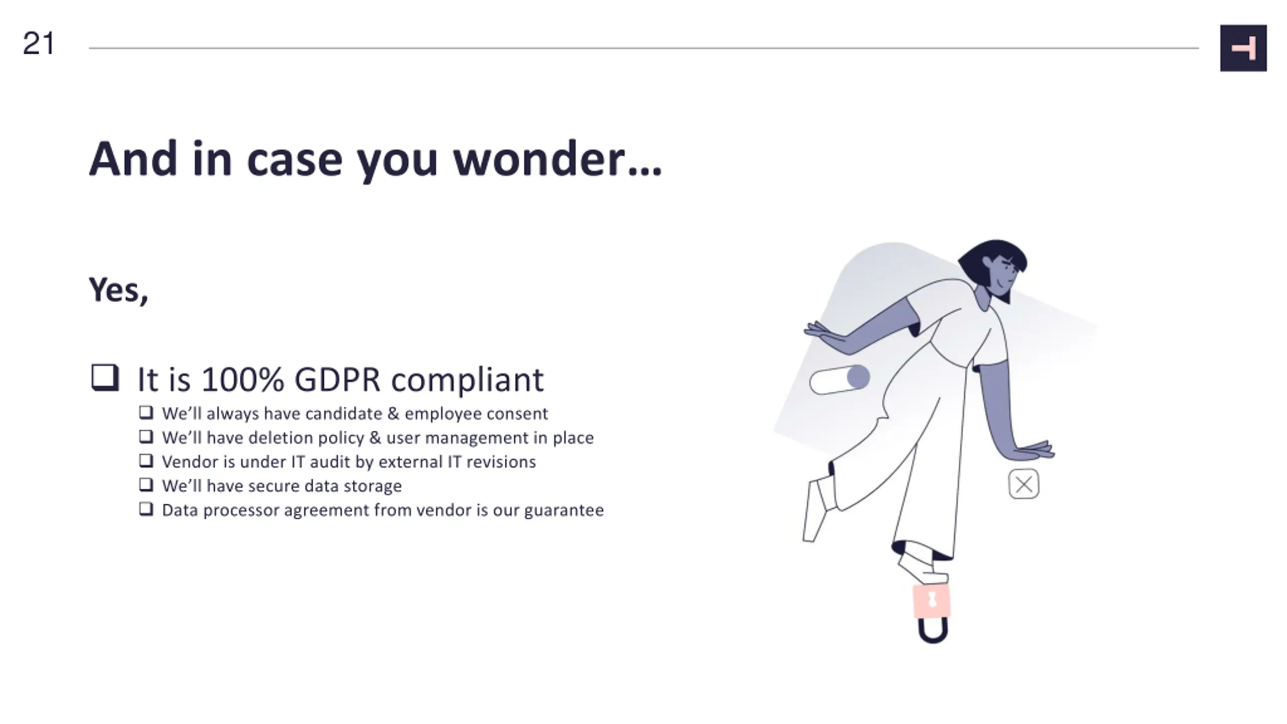 21 And in case you wonder Yes, It is 100% GDPR compliant We ll always have candidate & employee consent We ll have deletion policy & user management in place Vendor is under IT audit by external IT revisions We ll have secure data storage Data processor agreement from vendor is our guarantee