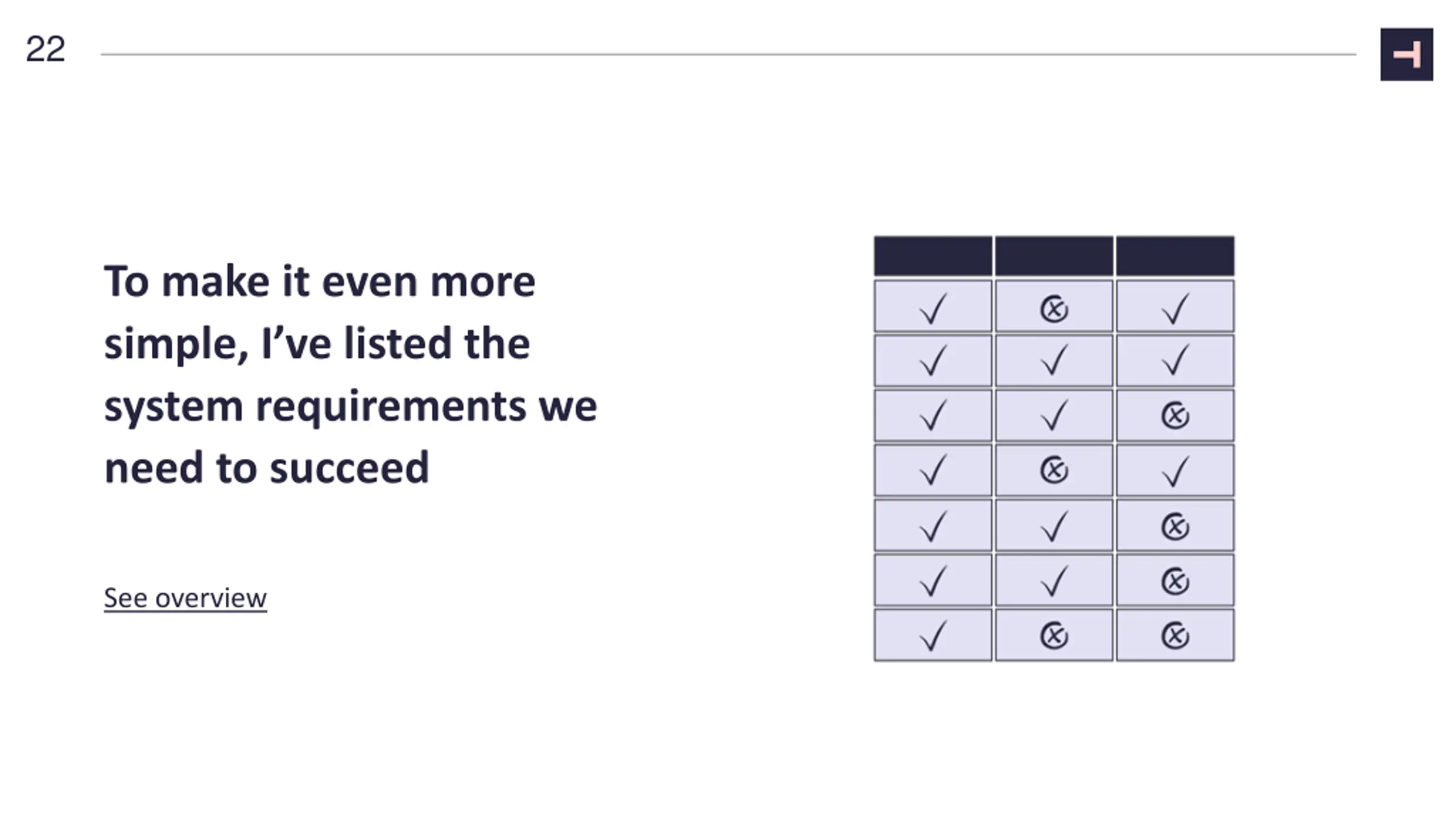 22 To make it even more simple, I ve listed the system requirements we need to succeed See overview