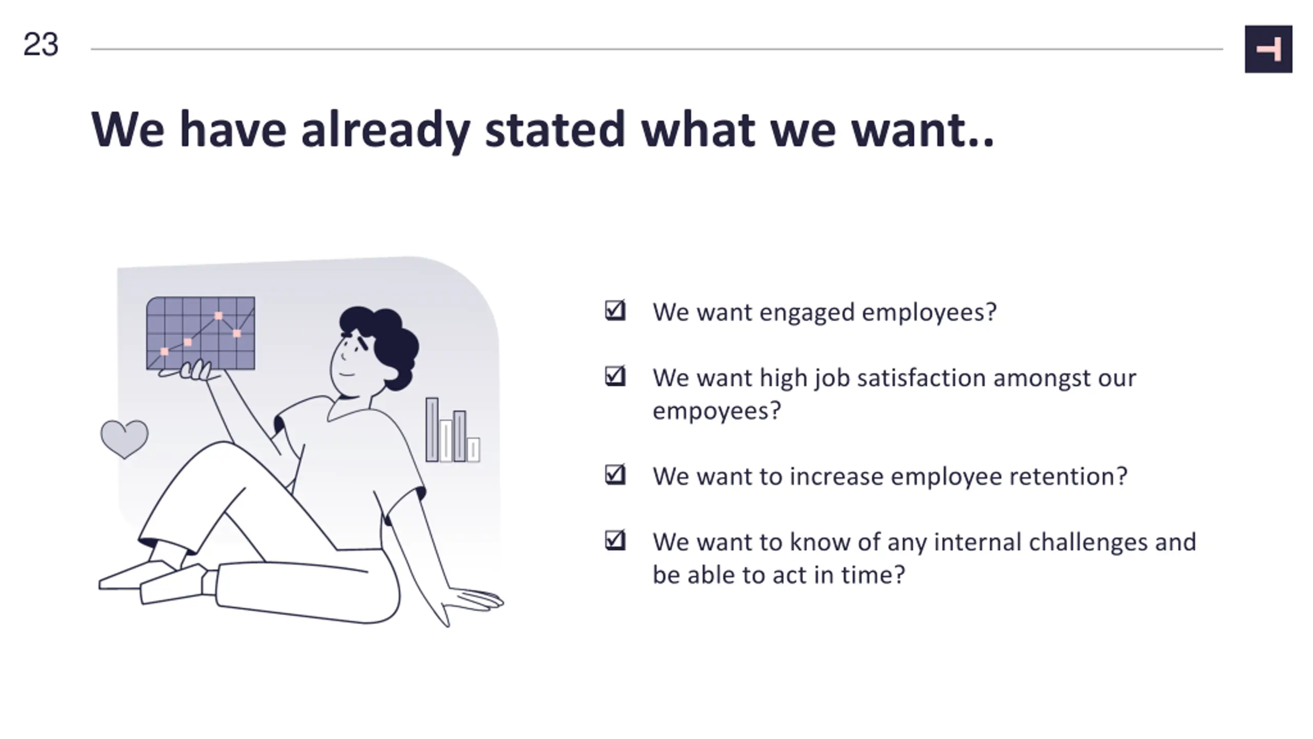 23 We have already stated what we want.. We want engaged employees? We want high job satisfaction amongst our empoyees? We want to increase employee retention? We want to know of any internal challenges and be able to act in time?