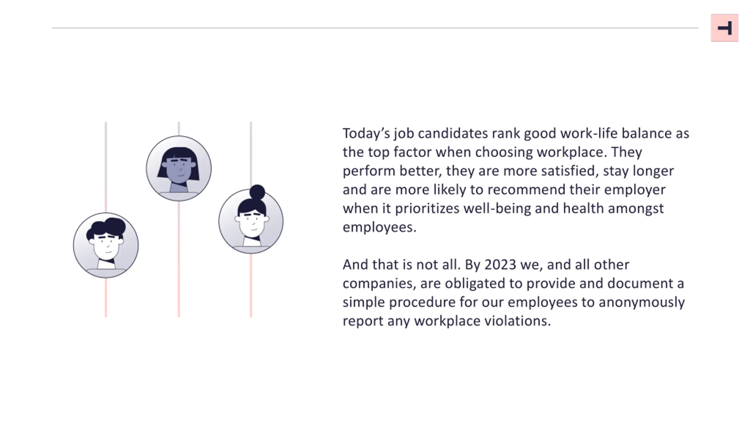 3 Today s job candidates rank good work-life balance as the top factor when choosing workplace. They perform better, they are more satisfied, stay longer and are more likely to recommend their employer when it prioritizes well-being and health amongst employees. And that is not all. By 2023 we, and all other companies, are obligated to provide and document a simple procedure for our employees to anonymously report any workplace violations.