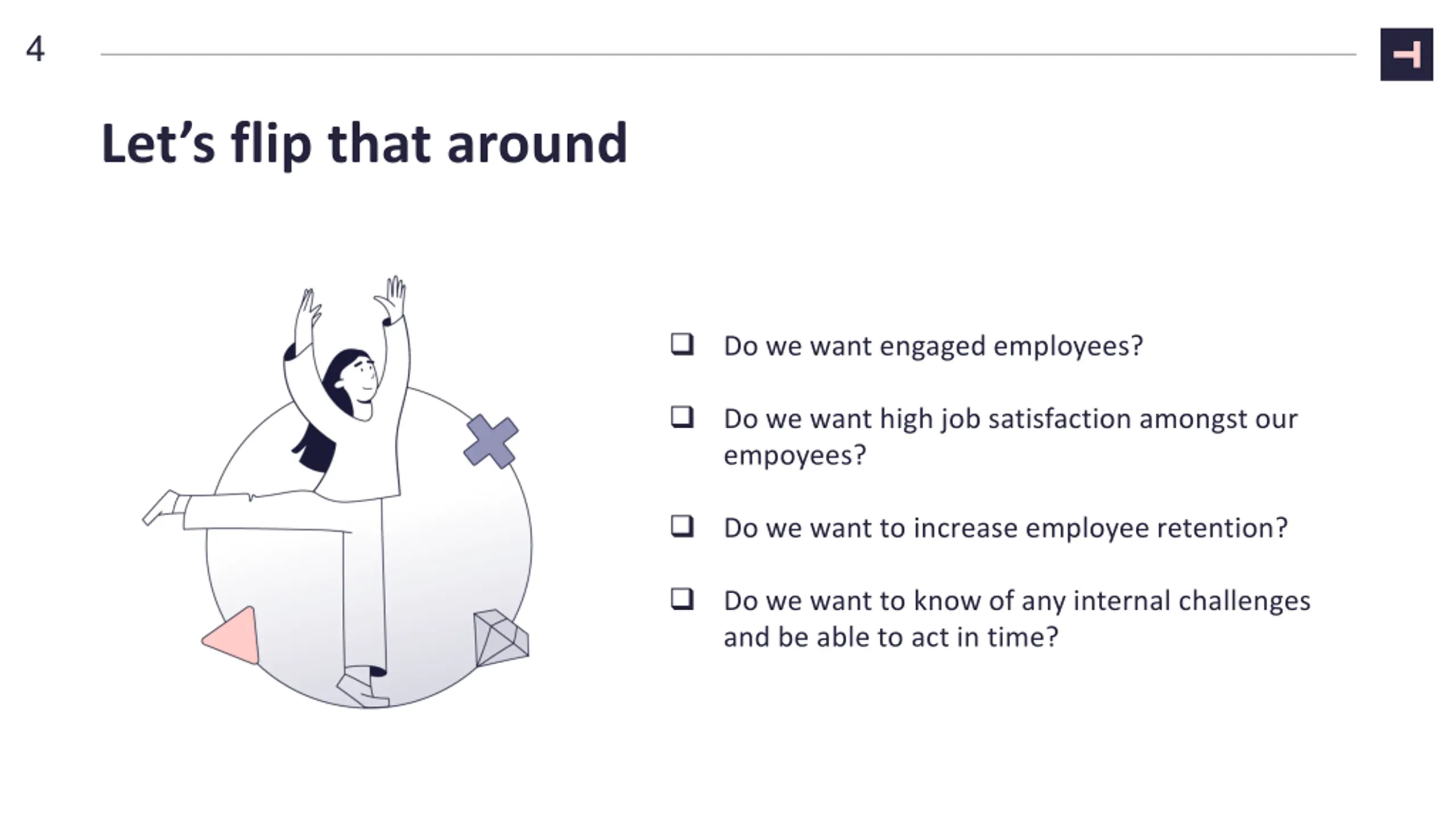 4 Let s flip that around Do we want engaged employees? Do we want high job satisfaction amongst our empoyees? Do we want to increase employee retention? Do we want to know of any internal challenges and be able to act in time?