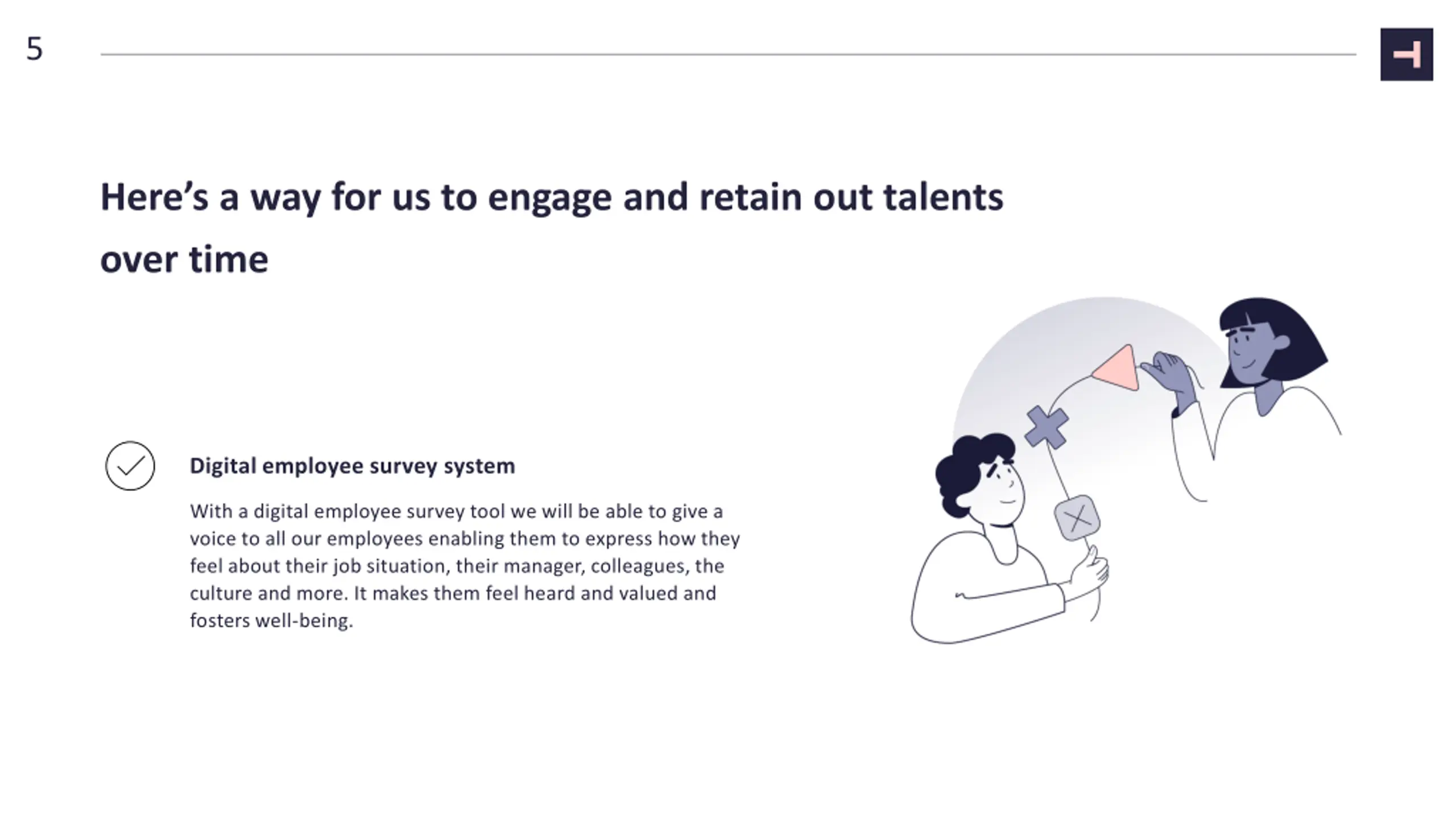 5 Here s a way for us to engage and retain out talents over time Digital employee survey system With a digital employee survey tool we will be able to give a voice to all our employees enabling them to express how they feel about their job situation, their manager, colleagues, the culture and more. It makes them feel heard and valued and fosters well-being.