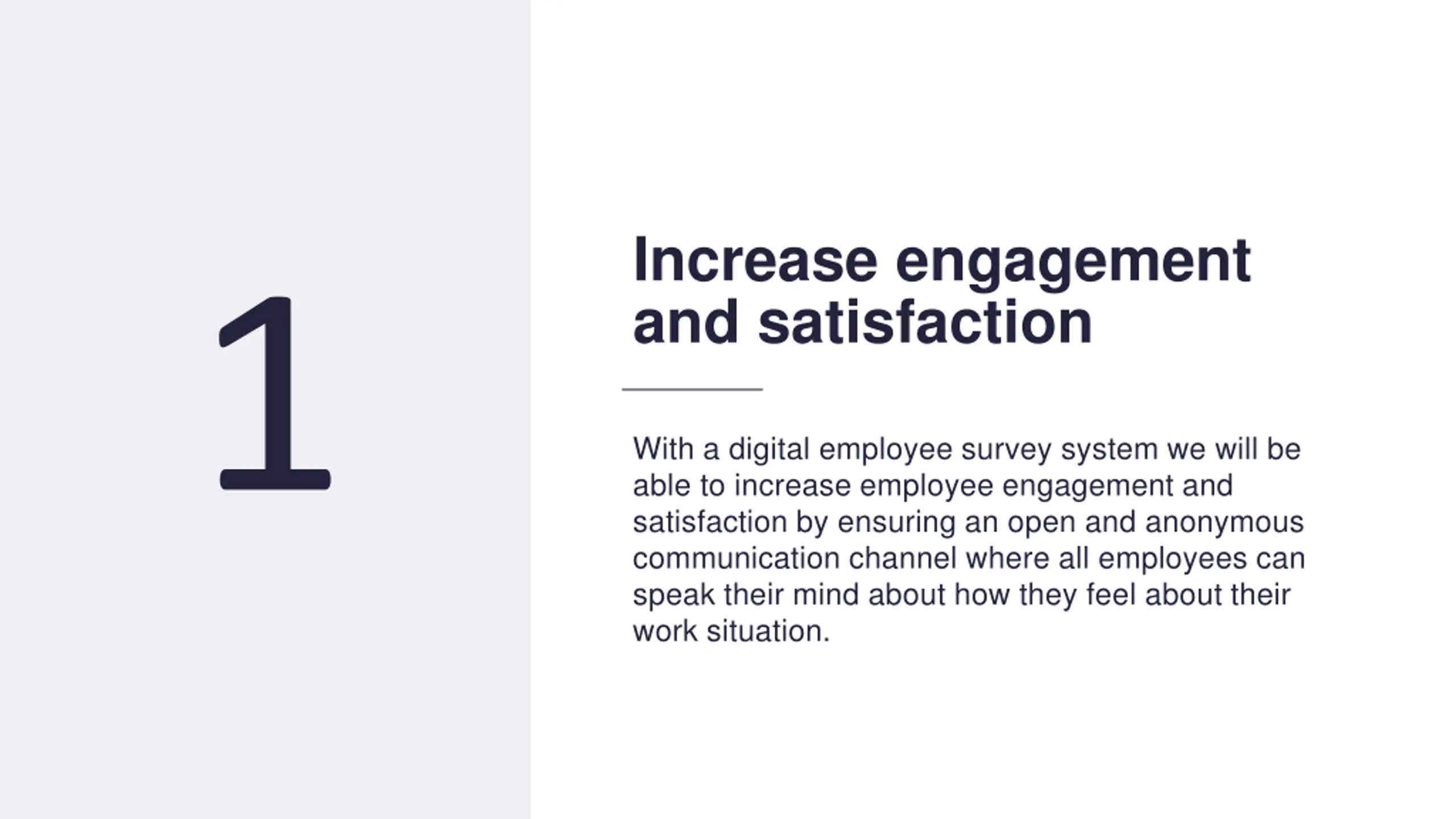 7 Increase engagement and satisfaction 1 With a digital employee survey system we will be able to increase employee engagement and satisfaction by ensuring an open and anonymous communication channel where all employees can speak their mind about how they feel about their work situation.