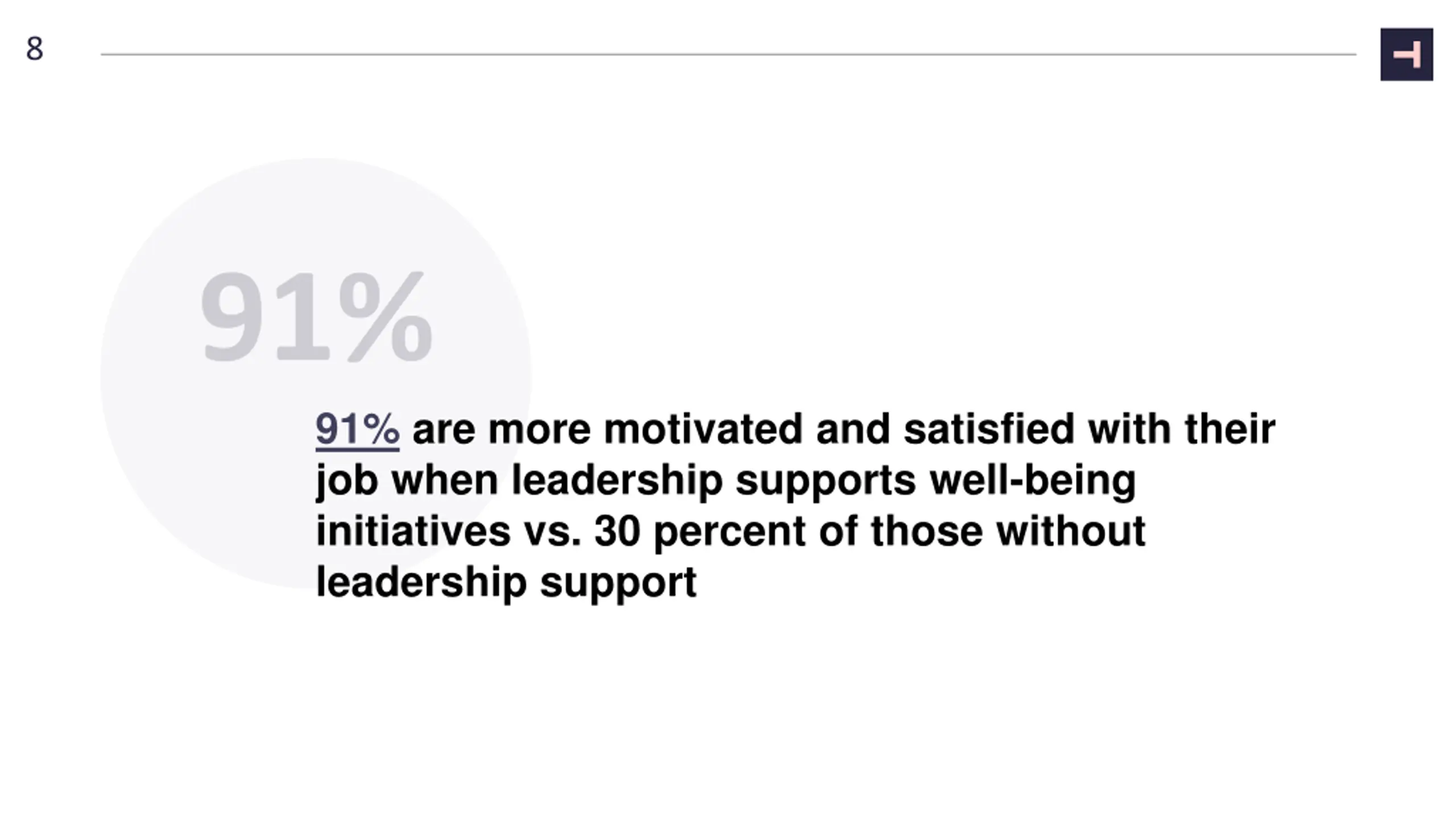8 91% are more motivated and satisfied with their job when leadership supports well-being initiatives vs. 30 percent of those without leadership support