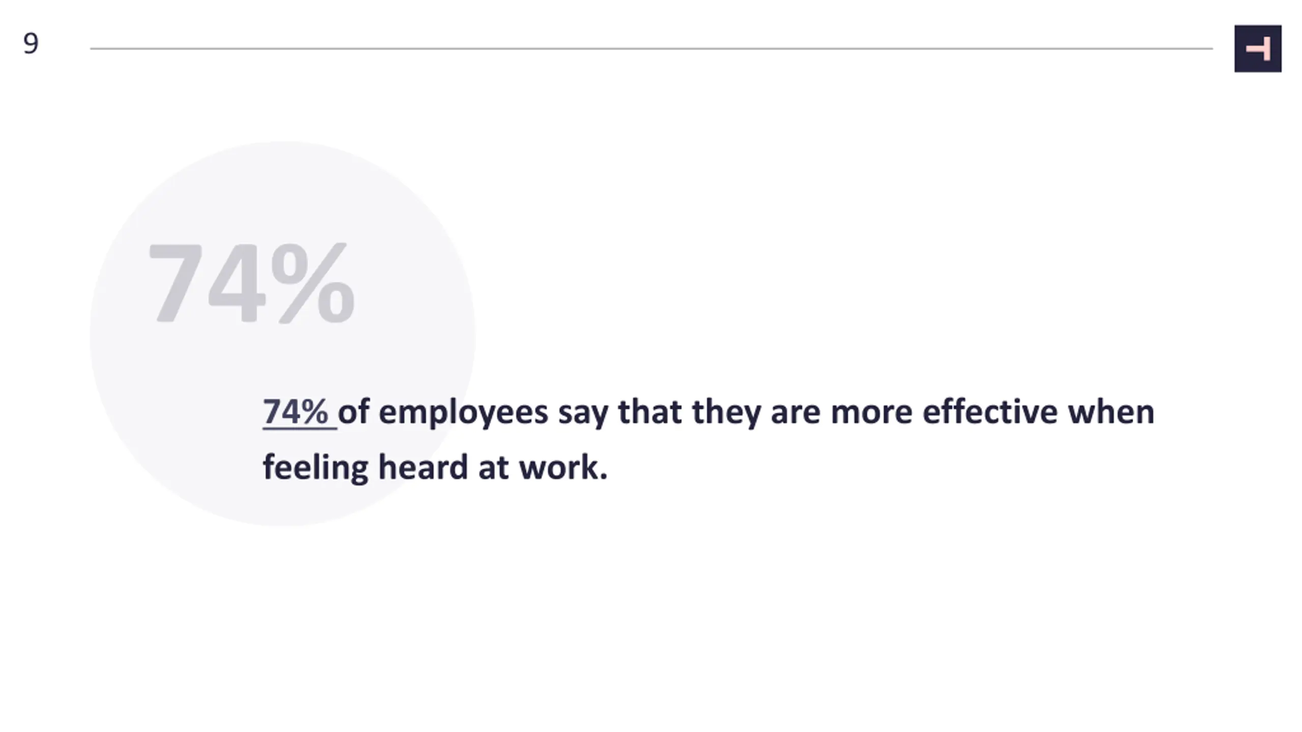9 74% of employees say that they are more effective when feeling heard at work.
