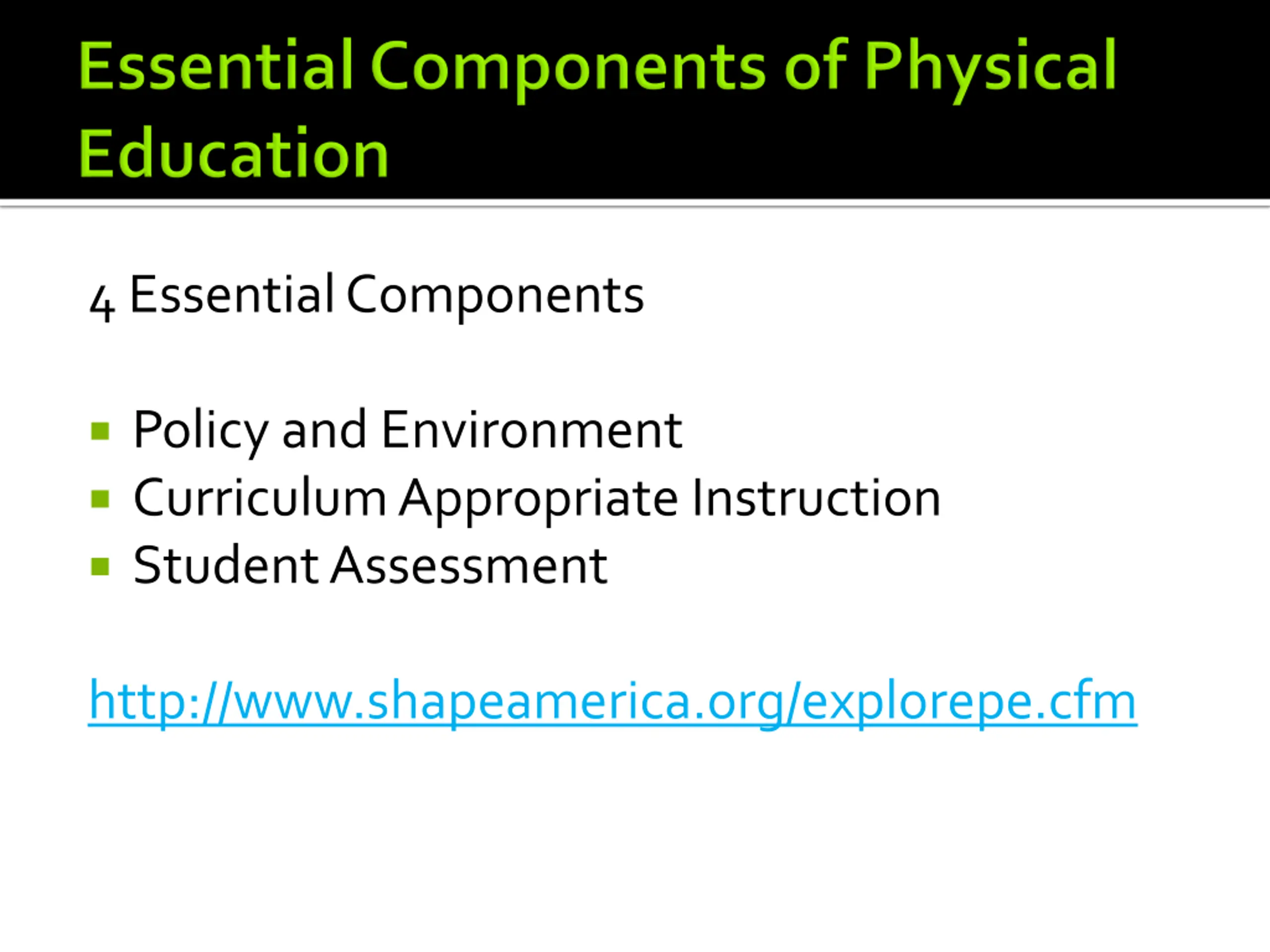 4 Essential Components Policy and Environment CurriculumAppropriate Instruction Student Assessment http://www.shapeamerica.org/explorepe.cfm