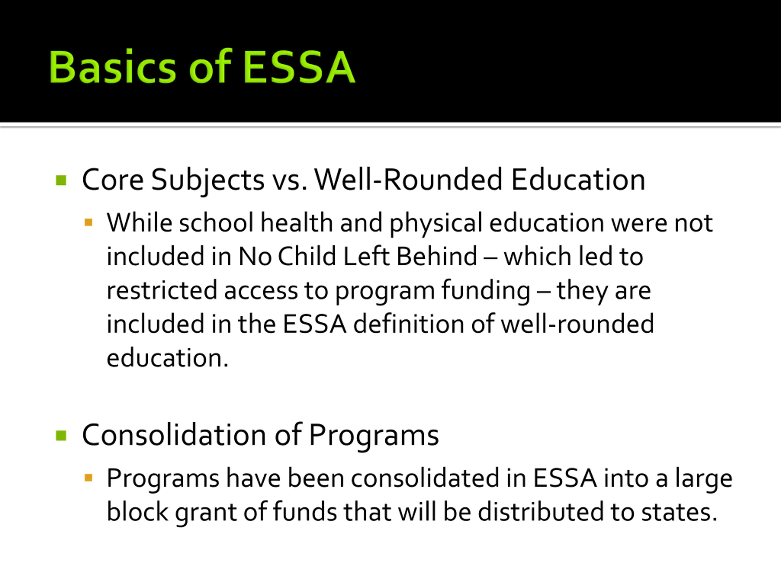 Core Subjects vs. Well-Rounded Education While school health and physical education were not included in No Child Left Behind which led to restricted access to program funding they are included in the ESSA definition of well-rounded education. Consolidation of Programs Programs have been consolidated in ESSA into a large block grant of funds that will be distributed to states.