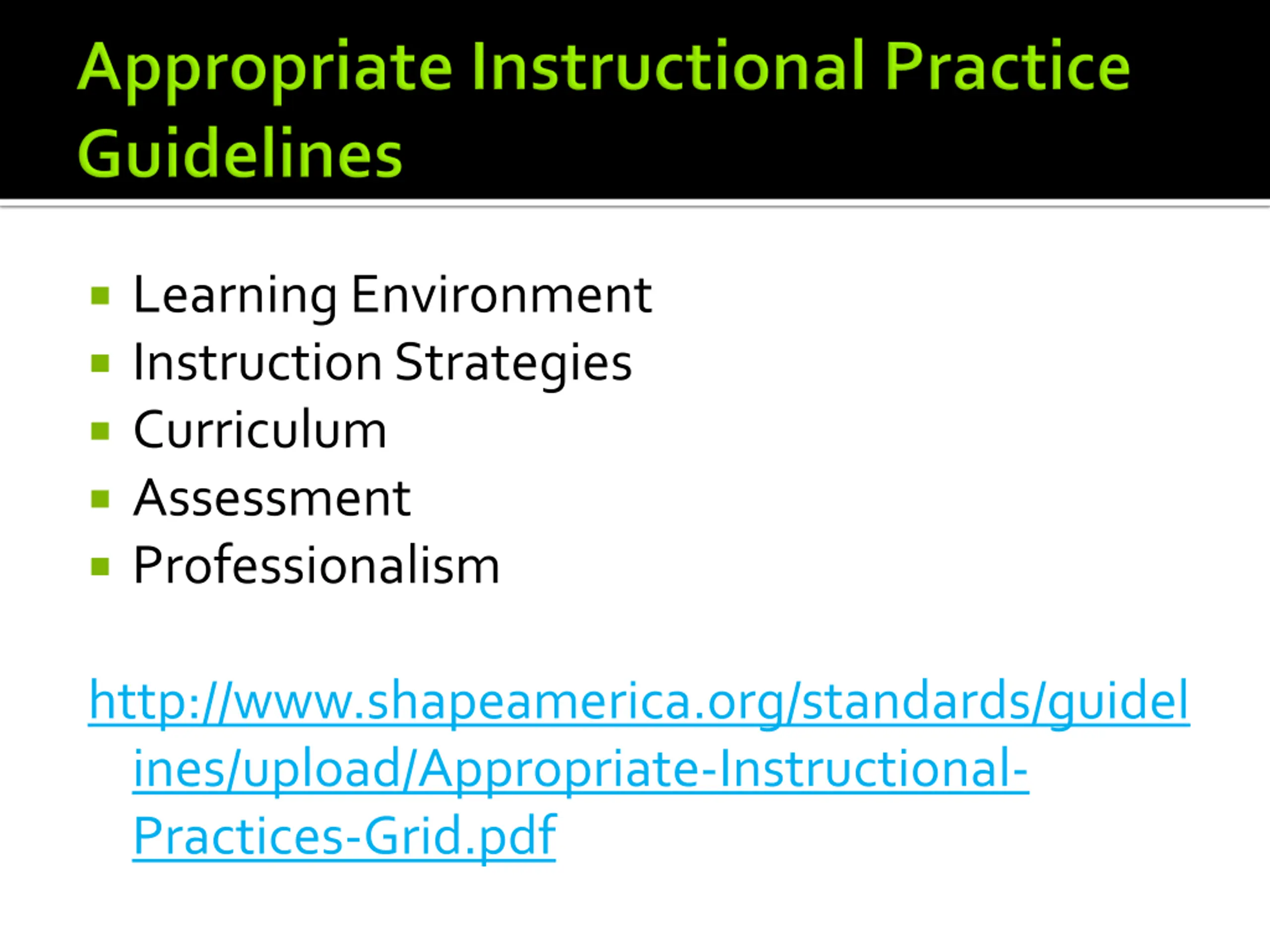 Learning Environment Instruction Strategies Curriculum Assessment Professionalism http://www.shapeamerica.org/standards/guidel ines/upload/Appropriate-Instructional- Practices-Grid.pdf