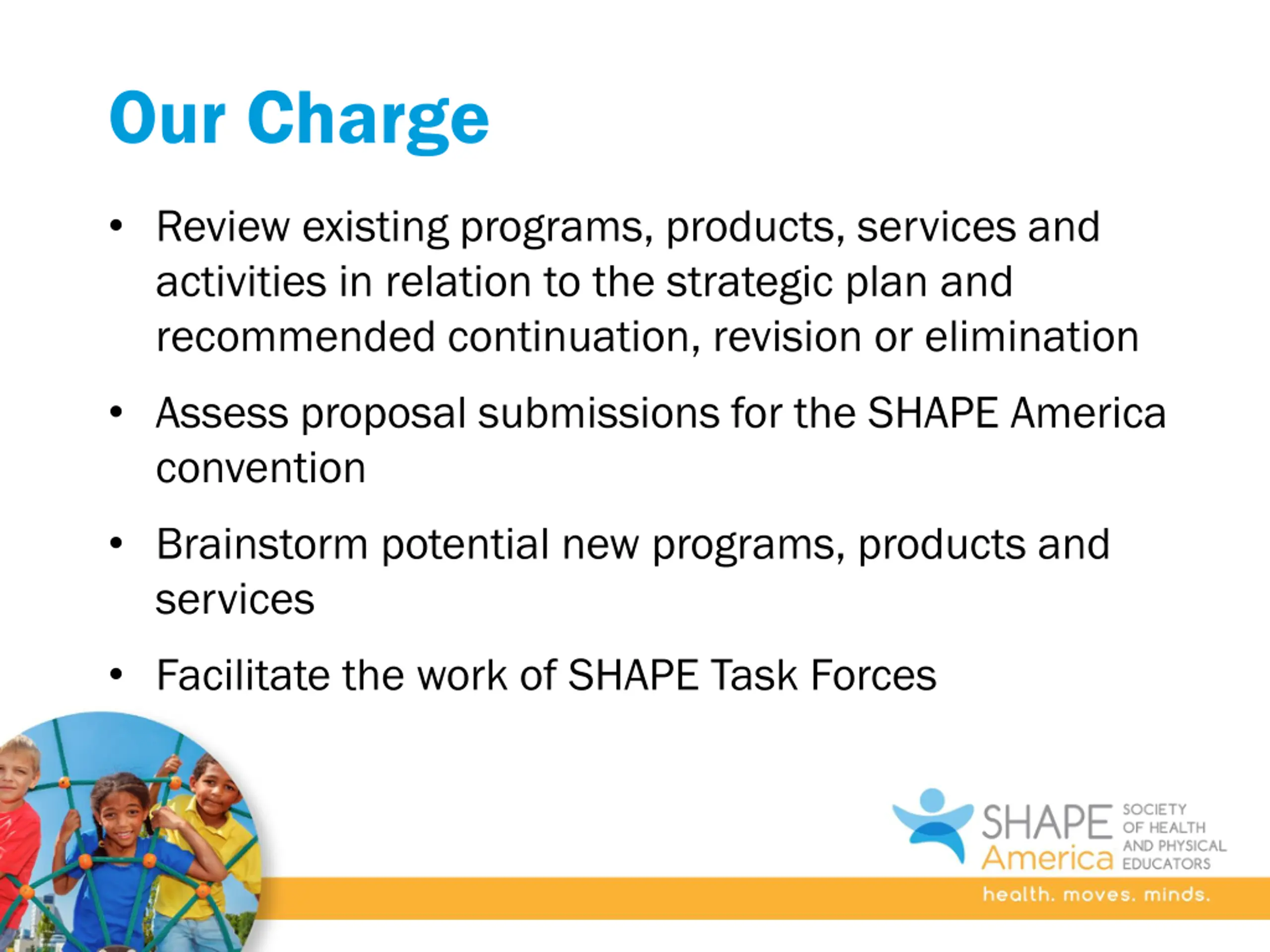Our Charge Review existing programs, products, services and activities in relation to the strategic plan and recommended continuation, revision or elimination Assess proposal submissions for the SHAPE America convention Brainstorm potential new programs, products and services Facilitate the work of SHAPE Task Forces