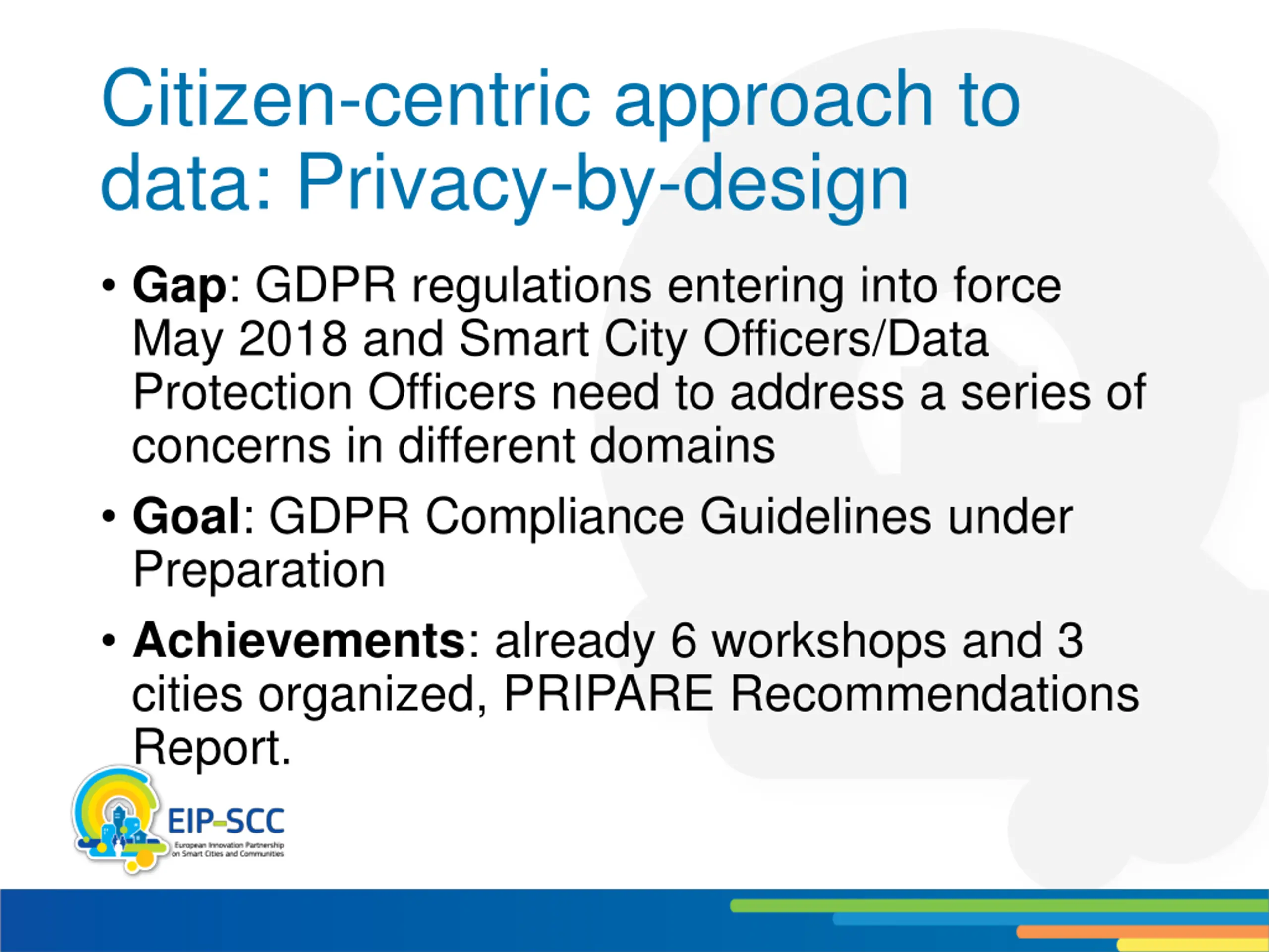 Citizen-centric approach to data: Privacy-by-design Gap: GDPR regulations entering into force May 2018 and Smart City Officers/Data Protection Officers need to address a series of concerns in different domains Goal: GDPR Compliance Guidelines under Preparation Achievements: already 6 workshops and 3 cities organized, PRIPARE Recommendations Report.