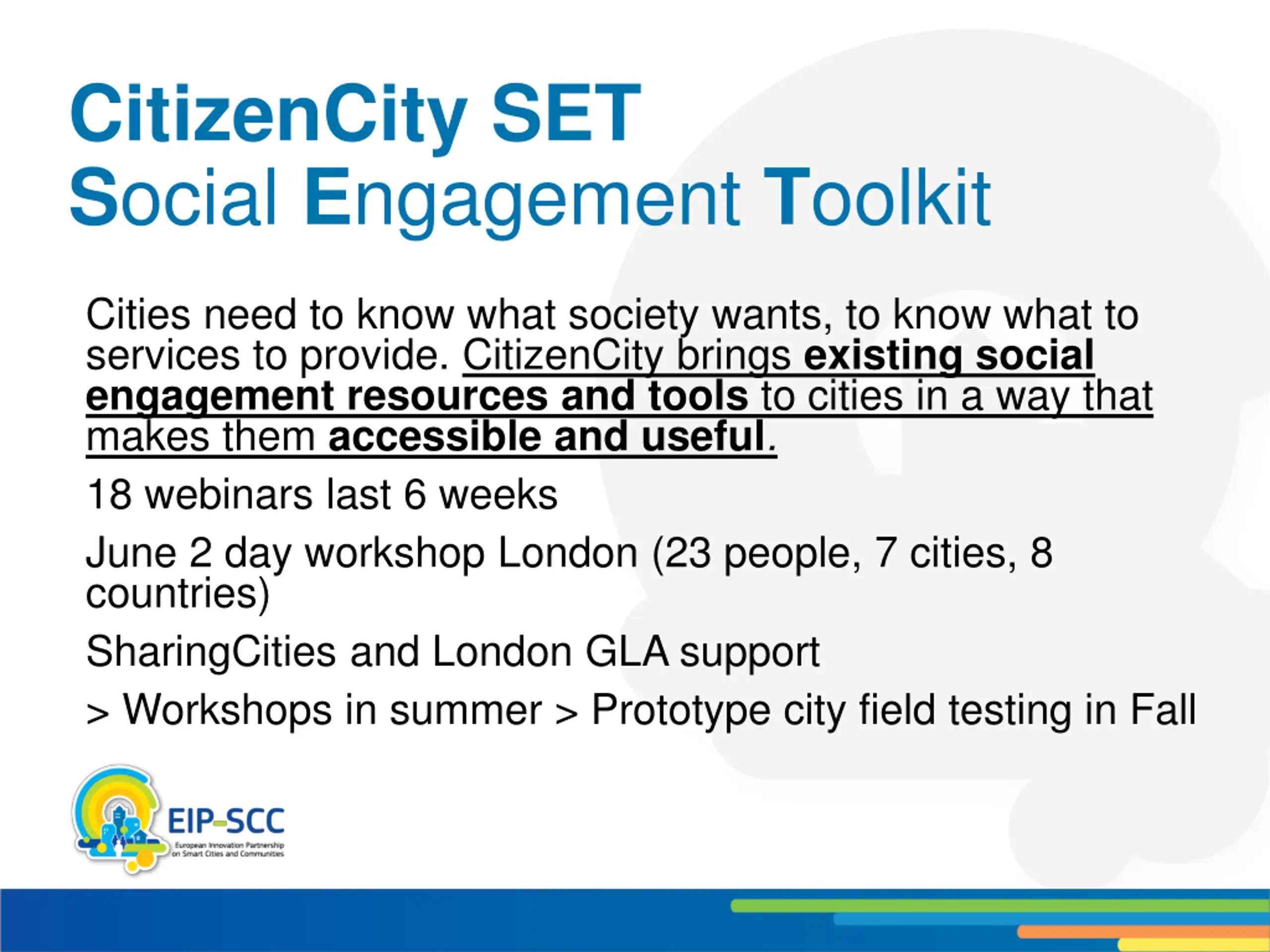CitizenCity SET Social Engagement Toolkit Cities need to know what society wants, to know what to services to provide. CitizenCity brings existing social engagement resources and tools to cities in a way that makes them accessible and useful. 18 webinars last 6 weeks June 2 day workshop London (23 people, 7 cities, 8 countries) SharingCities and London GLA support > Workshops in summer > Prototype city field testing in Fall