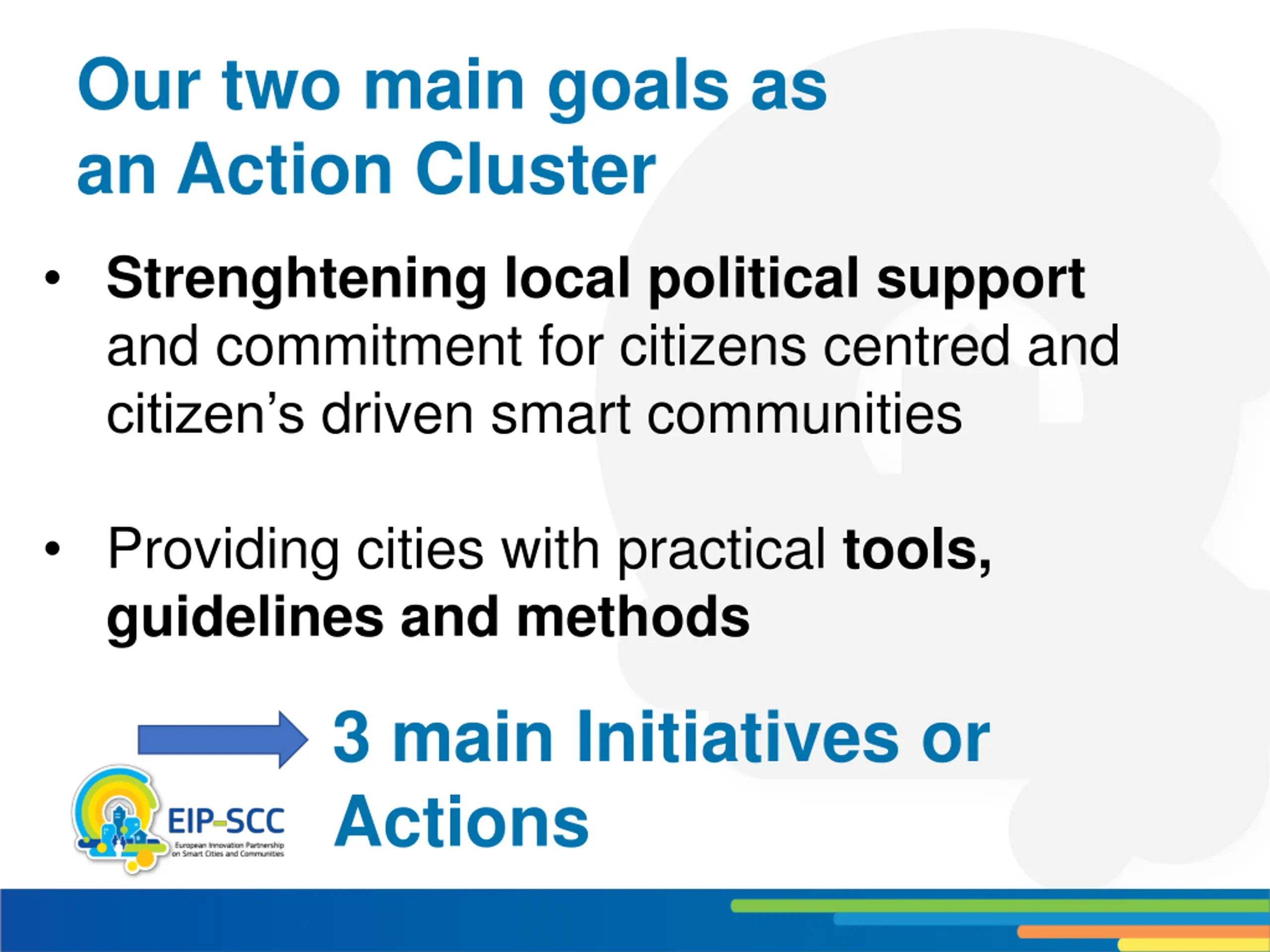 Our two main goals as an Action Cluster Strenghtening local political support and commitment for citizens centred and citizen s driven smart communities Providing cities with practical tools, guidelines and methods 3 main Initiatives or Actions