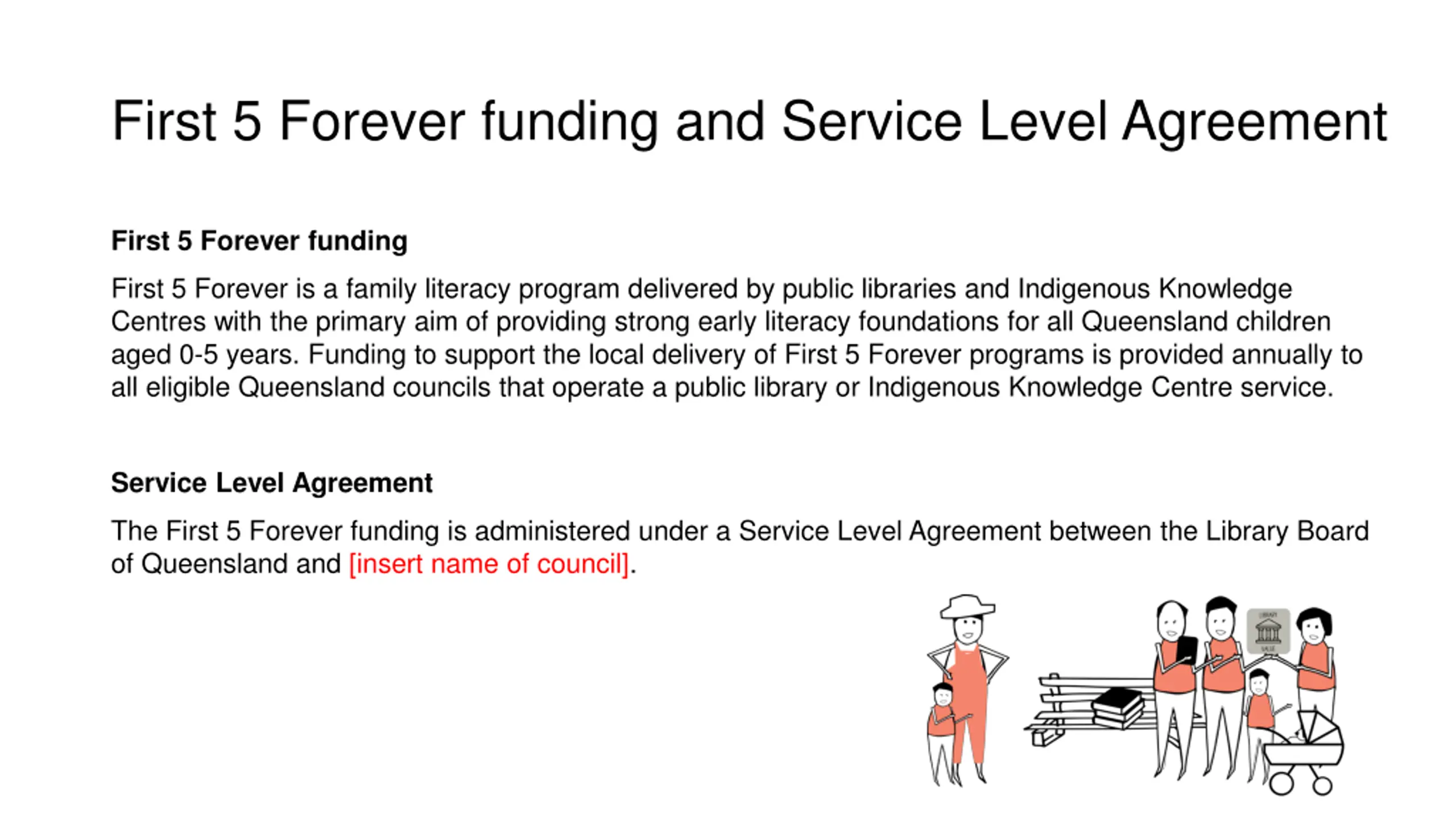 First 5 Forever funding and Service Level Agreement First 5 Forever funding First 5 Forever is a family literacy program delivered by public libraries and Indigenous Knowledge Centres with the primary aim of providing strong early literacy foundations for all Queensland children aged 0-5 years. Funding to support the local delivery of First 5 Forever programs is provided annually to all eligible Queensland councils that operate a public library or Indigenous Knowledge Centre service. Service Level Agreement The First 5 Forever funding is administered under a Service Level Agreement between the Library Board of Queensland and [insert name of council].