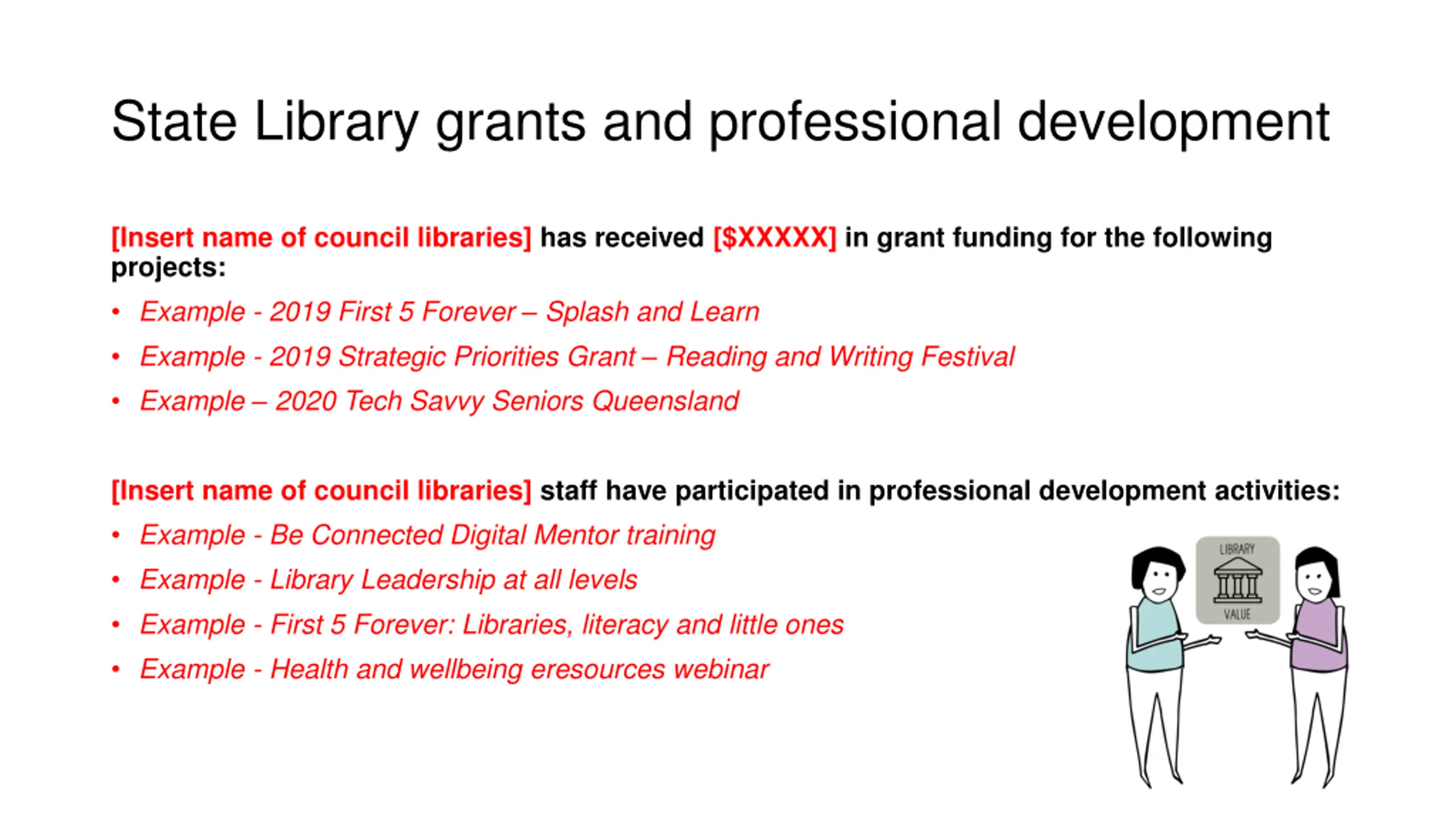 State Library grants and professional development [Insert name of council libraries] has received [$XXXXX] in grant funding for the following projects: Example - 2019 First 5 Forever Splash and Learn Example - 2019 Strategic Priorities Grant Reading and Writing Festival Example 2020 Tech Savvy Seniors Queensland [Insert name of council libraries] staff have participated in professional development activities: Example - Be Connected Digital Mentor training Example - Library Leadership at all levels Example - First 5 Forever: Libraries, literacy and little ones Example - Health and wellbeing eresources webinar