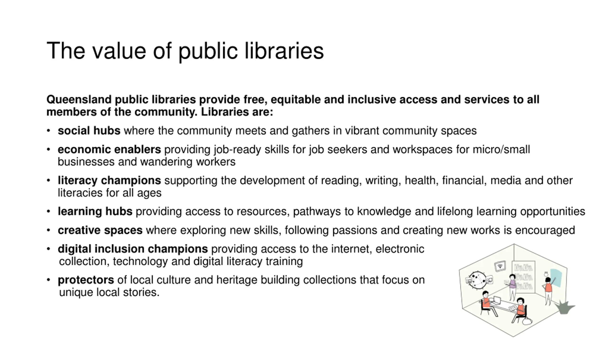 The value of public libraries Queensland public libraries provide free, equitable and inclusive access and services to all members of the community. Libraries are: social hubs where the community meets and gathers in vibrant community spaces economic enablers providing job-ready skills for job seekers and workspaces for micro/small businesses and wandering workers literacy champions supporting the development of reading, writing, health, financial, media and other literacies for all ages learning hubs providing access to resources, pathways to knowledge and lifelong learning opportunities creative spaces where exploring new skills, following passions and creating new works is encouraged digital inclusion champions providing access to the internet, electronic collection, technology and digital literacy training protectors of local culture and heritage building collections that focus on unique local stories.