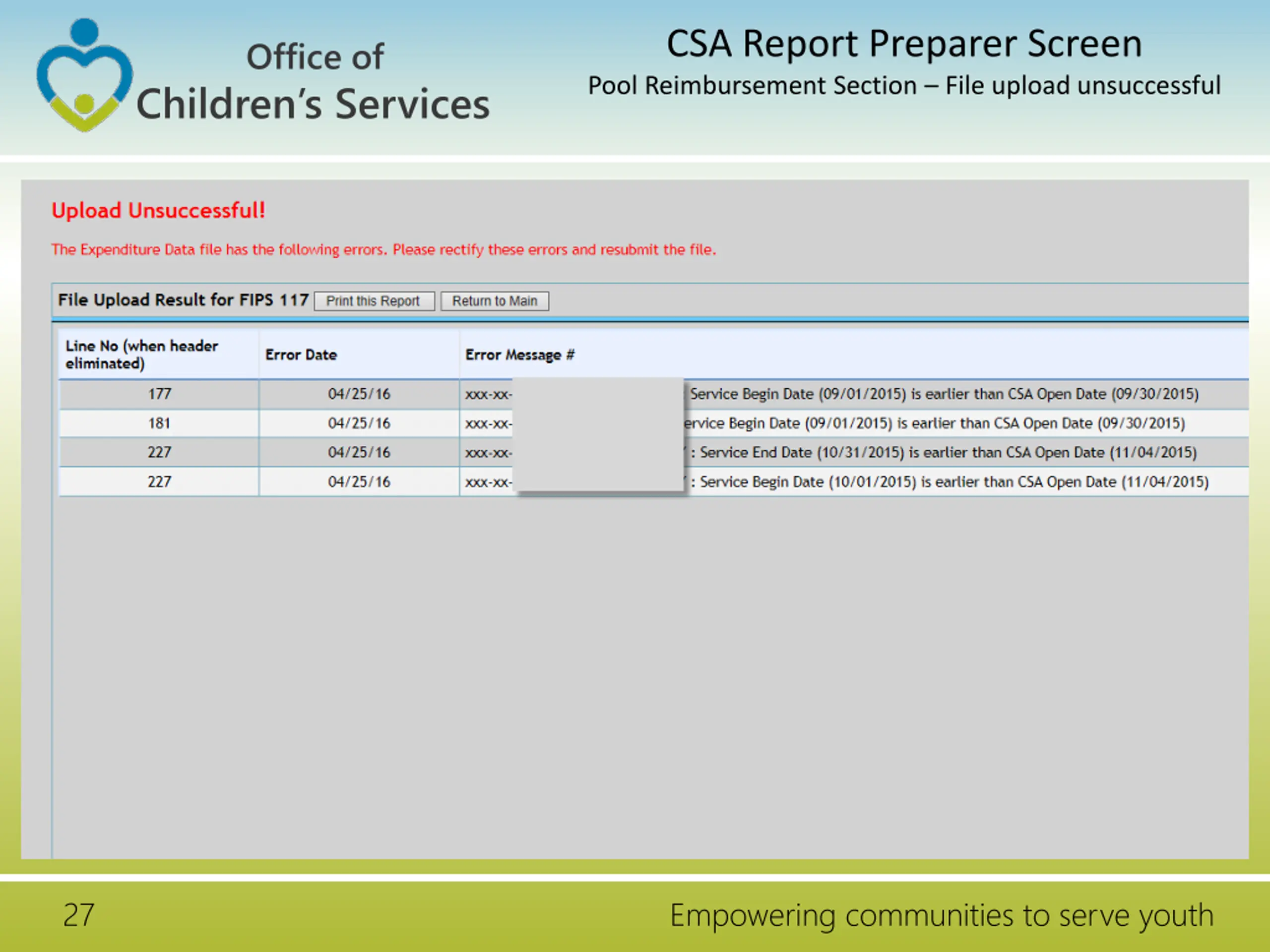 CSA Report Preparer Screen Pool Reimbursement Section File upload unsuccessful Office of Children s Services 27 Empowering communities to serve youth