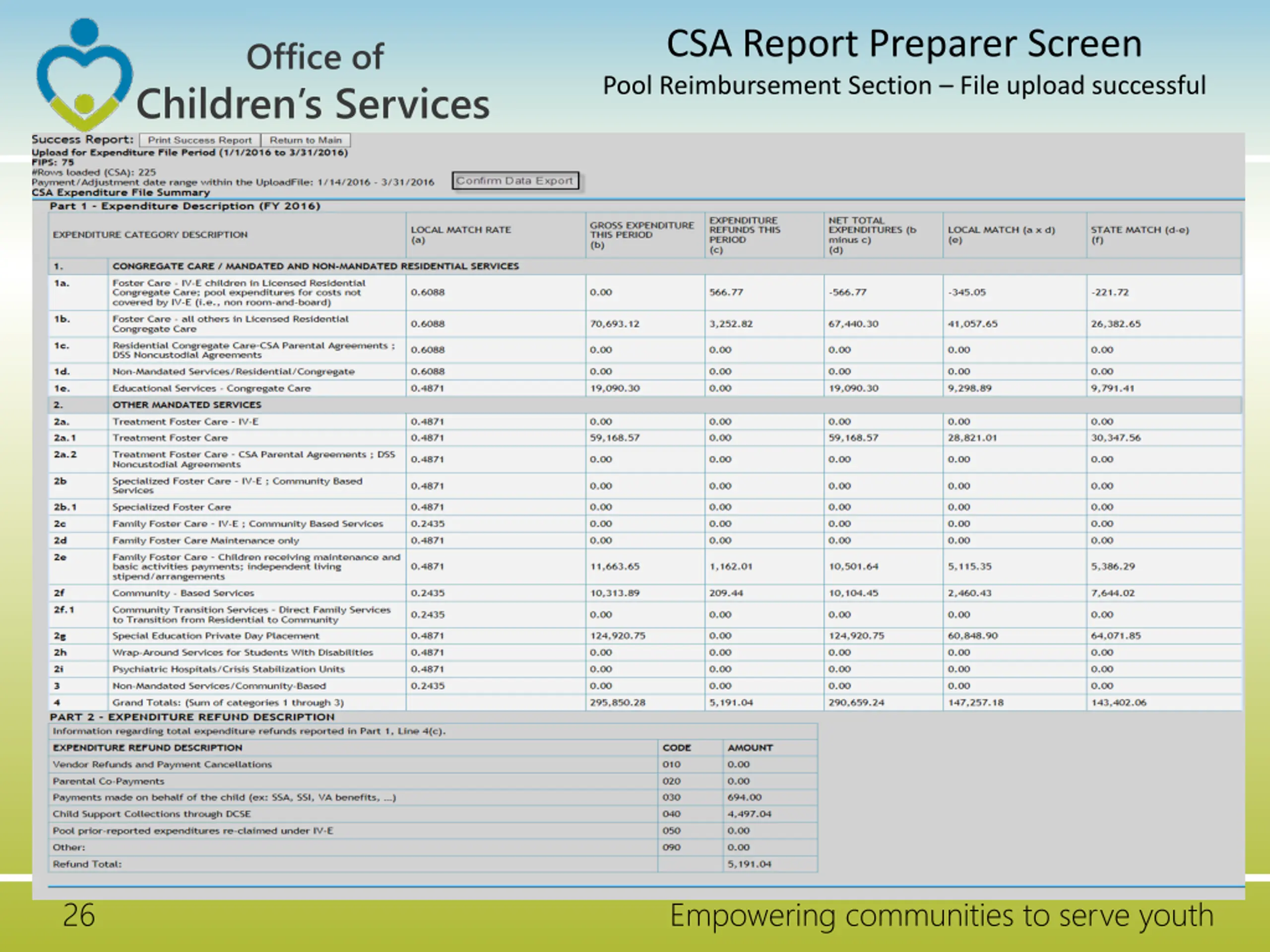 CSA Report Preparer Screen Pool Reimbursement Section File upload successful Office of Children s Services 26 Empowering communities to serve youth