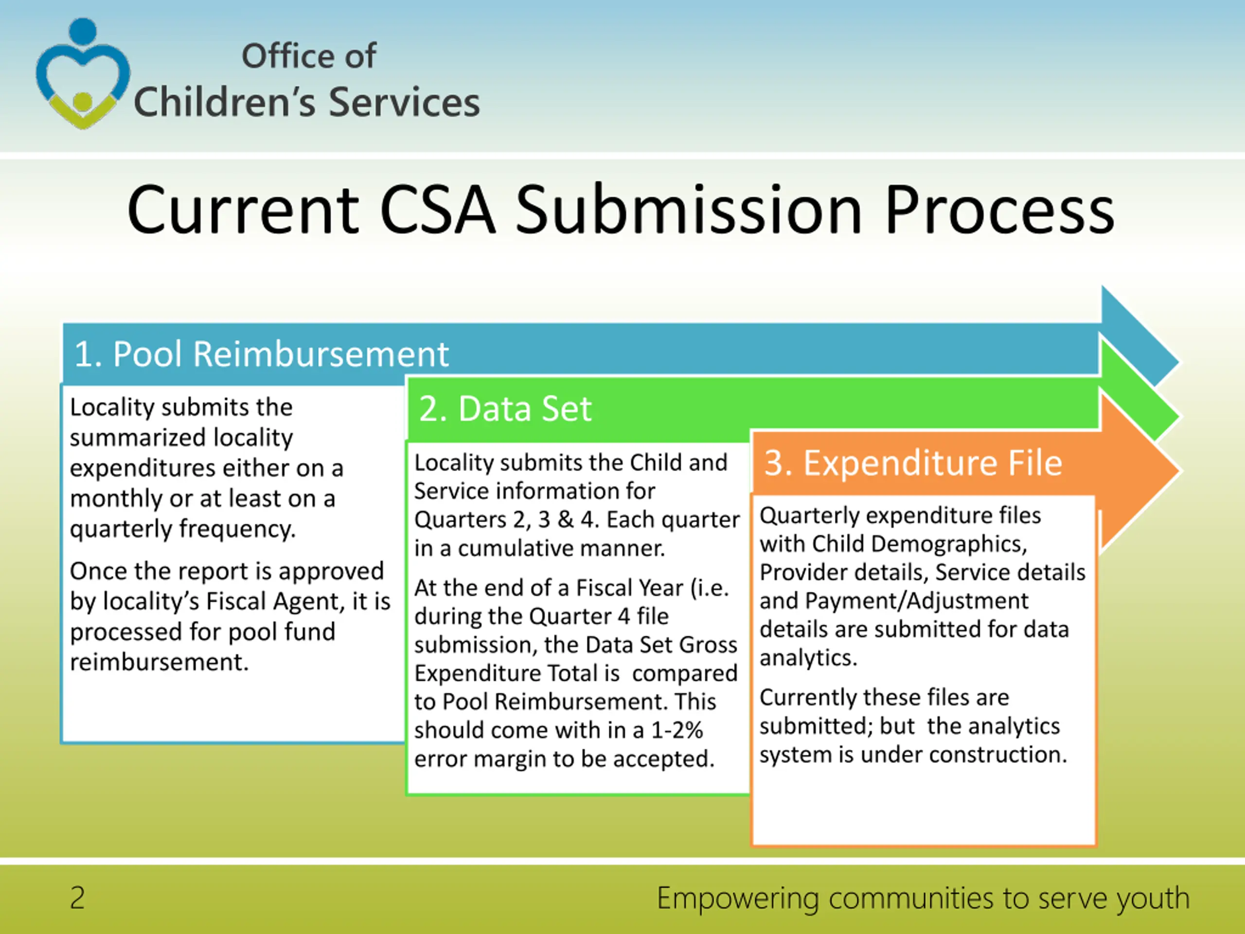 Office of Children s Services Current CSA Submission Process 1. Pool Reimbursement 2. Data Set Locality submits the summarized locality expenditures either on a monthly or at least on a quarterly frequency. 3. Expenditure File Locality submits the Child and Service information for Quarters 2, 3 & 4. Each quarter in a cumulative manner. Quarterly expenditure files with Child Demographics, Provider details, Service details and Payment/Adjustment details are submitted for data analytics. Once the report is approved by locality s Fiscal Agent, it is processed for pool fund reimbursement. At the end of a Fiscal Year (i.e. during the Quarter 4 file submission, the Data Set Gross Expenditure Total is compared to Pool Reimbursement. This should come with in a 1-2% error margin to be accepted. Currently these files are submitted; but the analytics system is under construction. 2 Empowering communities to serve youth