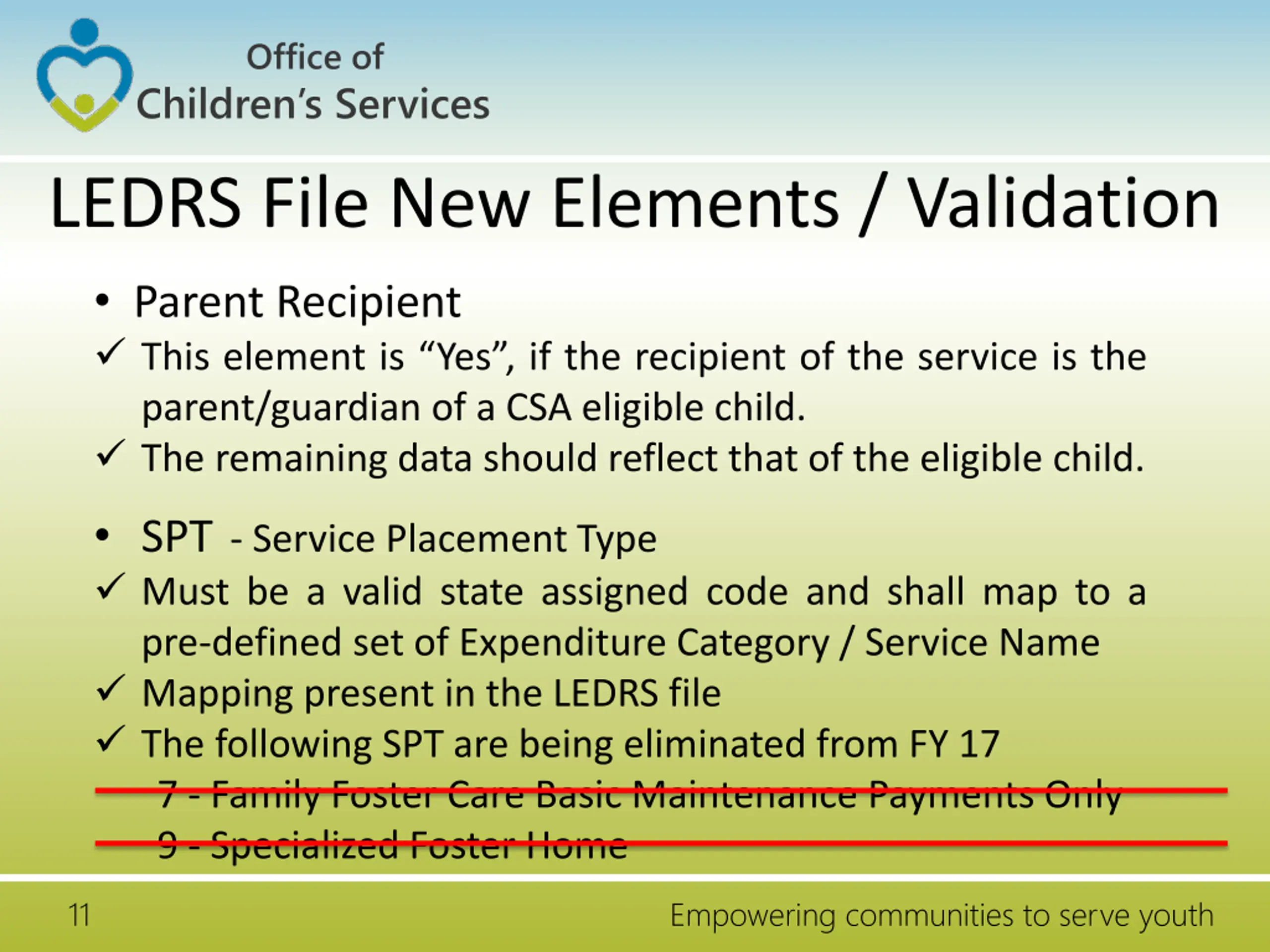 Office of Children s Services LEDRS File New Elements / Validation Parent Recipient This element is Yes , if the recipient of the service is the parent/guardian of a CSA eligible child. The remaining data should reflect that of the eligible child. SPT - Service Placement Type Must be a valid state assigned code and shall map to a pre-defined set of Expenditure Category / Service Name Mapping present in the LEDRS file The following SPT are being eliminated from FY 17 7 - Family Foster Care Basic Maintenance Payments Only 9 - Specialized Foster Home 11 Empowering communities to serve youth