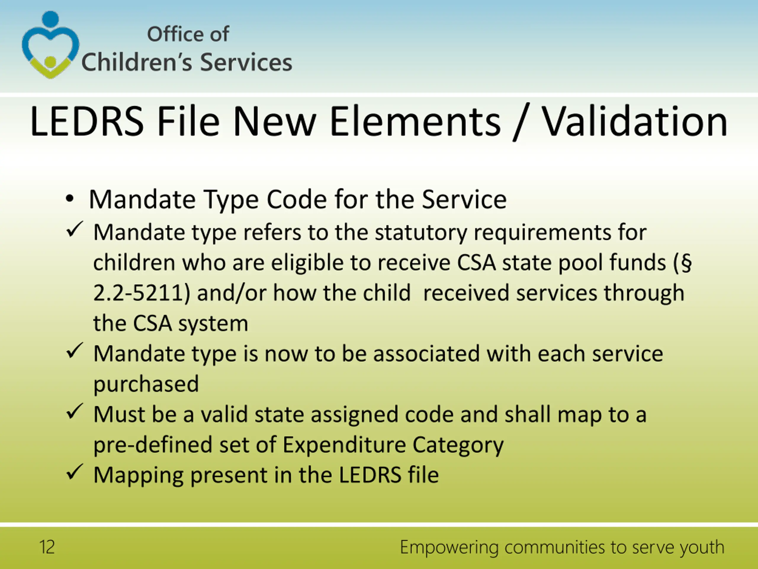Office of Children s Services LEDRS File New Elements / Validation Mandate Type Code for the Service Mandate type refers to the statutory requirements for children who are eligible to receive CSA state pool funds ( 2.2-5211) and/or how the child received services through the CSA system Mandate type is now to be associated with each service purchased Must be a valid state assigned code and shall map to a pre-defined set of Expenditure Category Mapping present in the LEDRS file 12 Empowering communities to serve youth