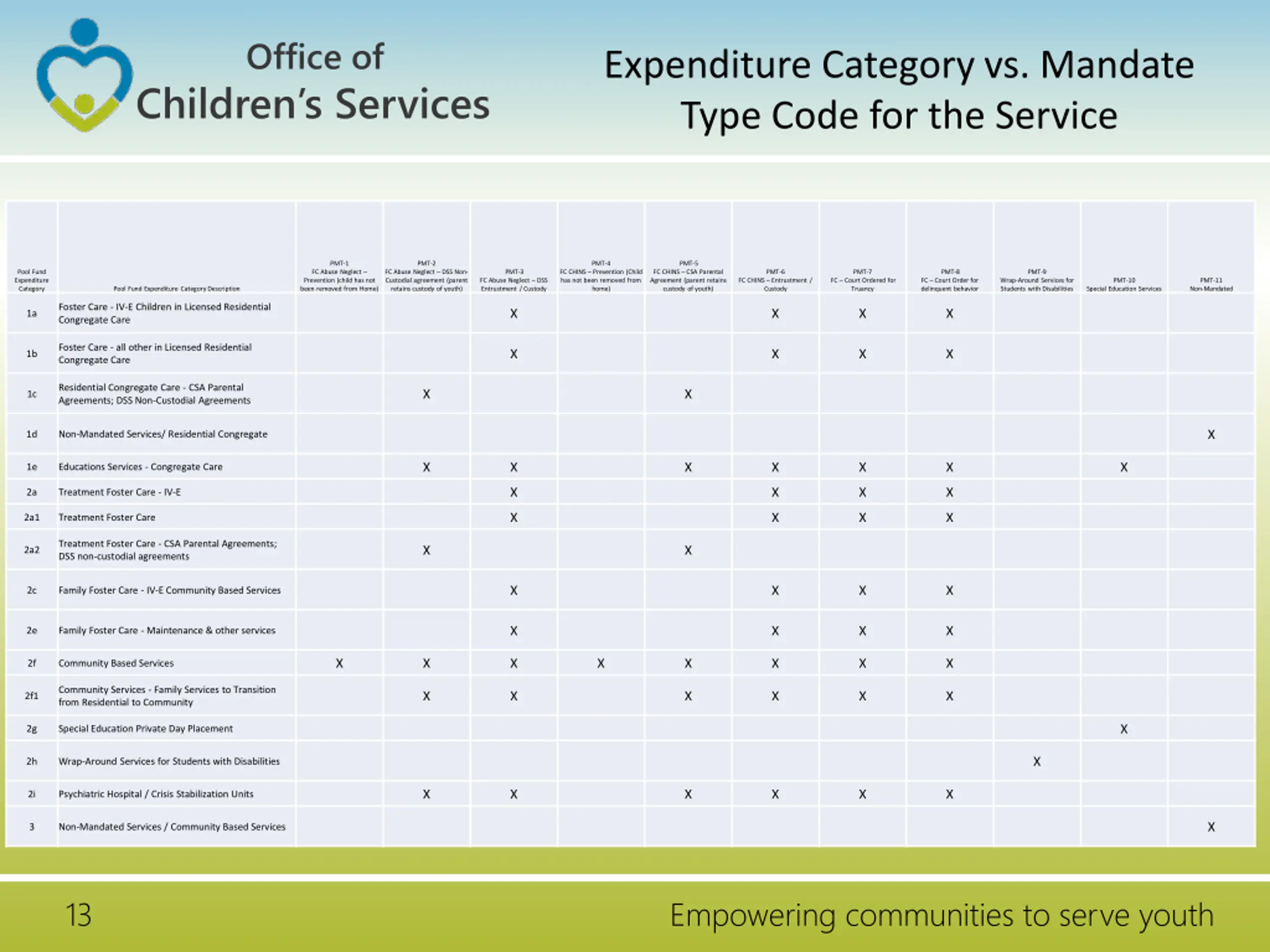 Office of Expenditure Category vs. Mandate Type Code for the Service Children s Services PMT-1 PMT-2 PMT-4 PMT-5 Pool Fund Expenditure Category FC Abuse Neglect Prevention (child has not been removed from Home) FC Abuse Neglect DSS Non- Custodial agreement (parent retains custody of youth) PMT-3 FC CHINS Prevention (Child has not been removed from home) FC CHINS CSA Parental Agreement (parent retains custody of youth) PMT-6 PMT-7 PMT-8 PMT-9 FC Abuse Neglect DSS Entrustment / Custody FC CHINS Entrustment / Custody FC Court Ordered for Truancy FC Court Order for delinquent behavior Wrap-Around Services for Students with Disabilities PMT-10 PMT-11 Non-Mandated Pool Fund Expenditure Category Description Special Education Services Foster Care - IV-E Children in Licensed Residential Congregate Care X X X X 1a Foster Care - all other in Licensed Residential Congregate Care X X X X 1b Residential Congregate Care - CSA Parental Agreements; DSS Non-Custodial Agreements X X 1c X 1d Non-Mandated Services/ Residential Congregate X X X X X X X 1e Educations Services - Congregate Care X X X X 2a Treatment Foster Care - IV-E X X X X 2a1 Treatment Foster Care Treatment Foster Care - CSA Parental Agreements; DSS non-custodial agreements X X 2a2 X X X X 2c Family Foster Care - IV-E Community Based Services X X X X 2e Family Foster Care - Maintenance & other services X X X X X X X X 2f Community Based Services Community Services - Family Services to Transition from Residential to Community X X X X X X 2f1 X 2g Special Education Private Day Placement X 2h Wrap-Around Services for Students with Disabilities X X X X X X 2i Psychiatric Hospital / Crisis Stabilization Units X 3 Non-Mandated Services / Community Based Services 13 Empowering communities to serve youth
