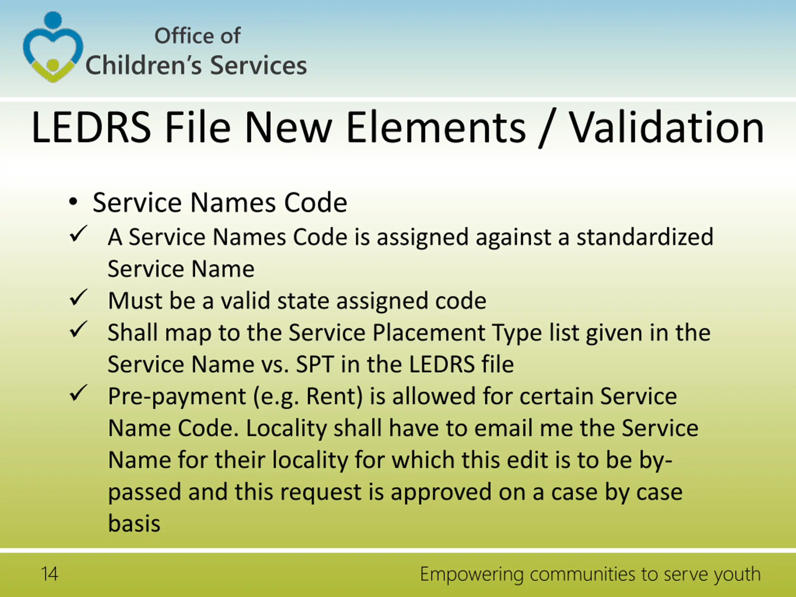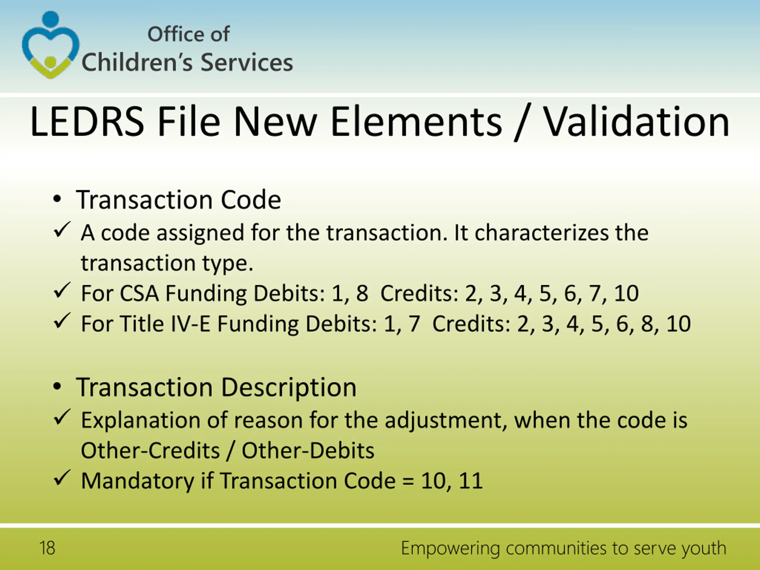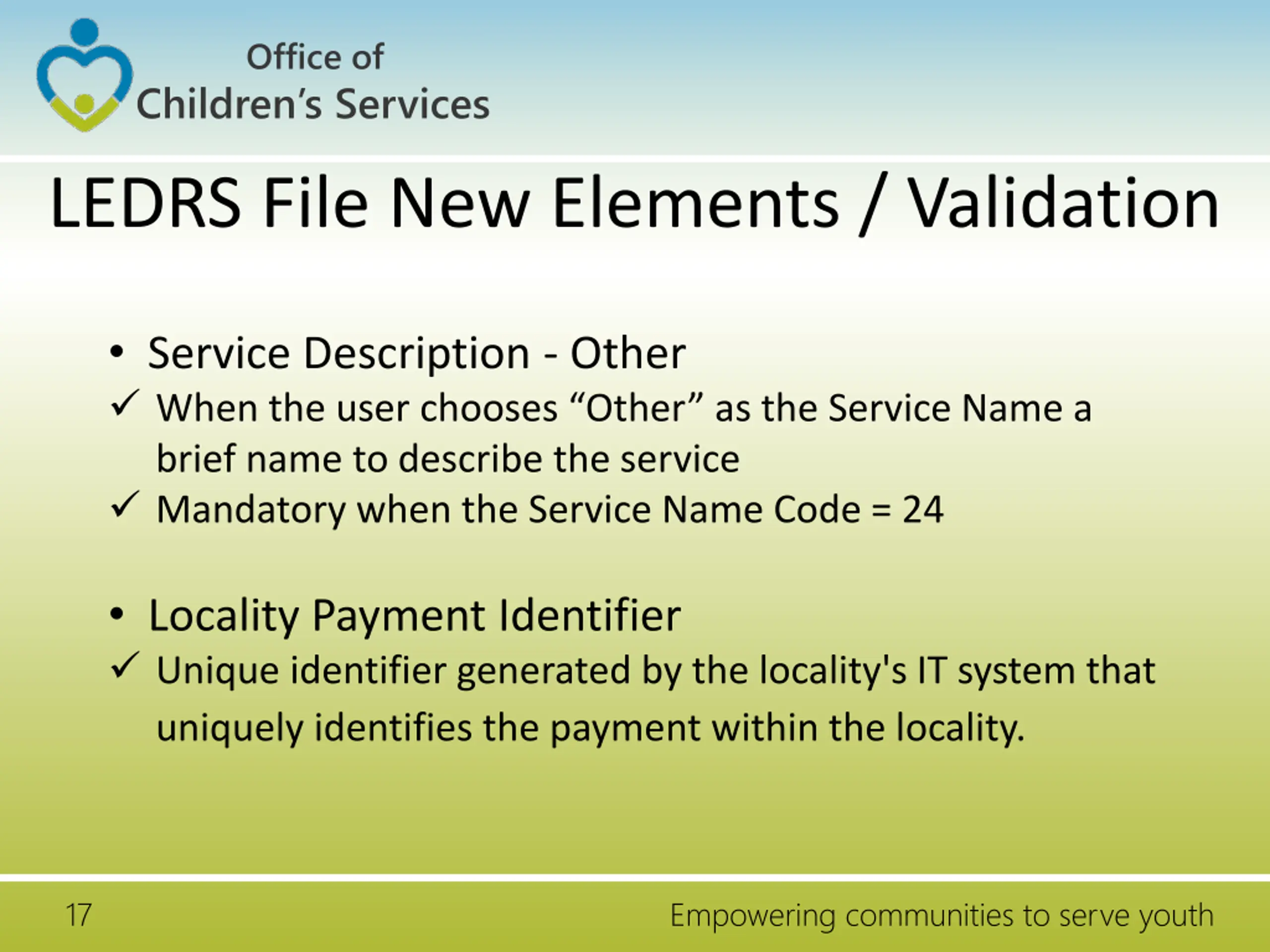 Office of Children s Services LEDRS File New Elements / Validation Service Description - Other When the user chooses Other as the Service Name a brief name to describe the service Mandatory when the Service Name Code = 24 Locality Payment Identifier Unique identifier generated by the locality's IT system that uniquely identifies the payment within the locality. 17 Empowering communities to serve youth